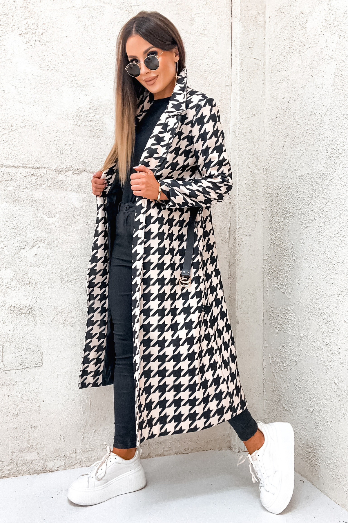 DŁUGI PŁASZCZ W PEPITKĘ WIĄZANY W PASIE