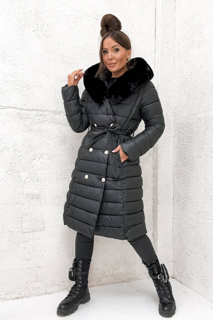 PIKOWANY PŁASZCZ ZE ZŁOTYMI GUZIKAMI I PASKIEM- CZARNY
