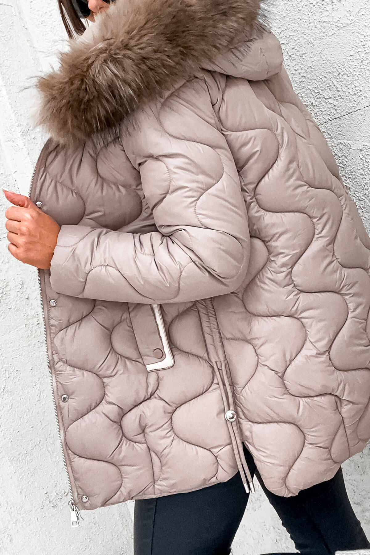 KURTKA PIKOWANA Z KAPTUREM I ŚCIĄGACZAMI PO BOKACH- BEŻOWA