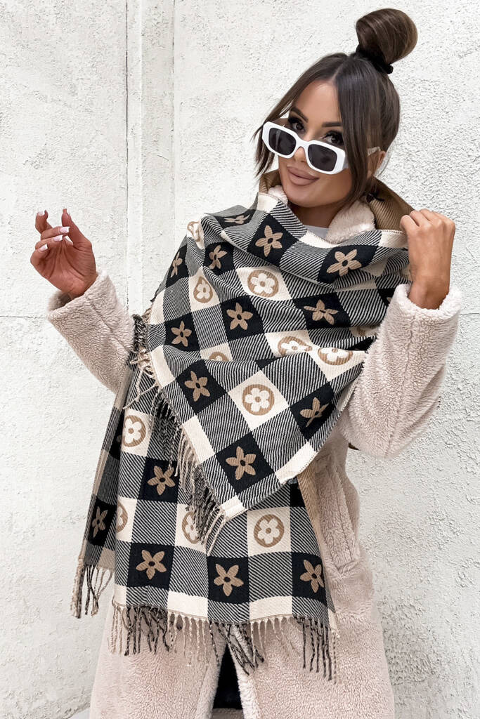 SZAL W KRATE Z MOTYWEM KWIATA Z FRĘDZLAMI- BEŻOWY