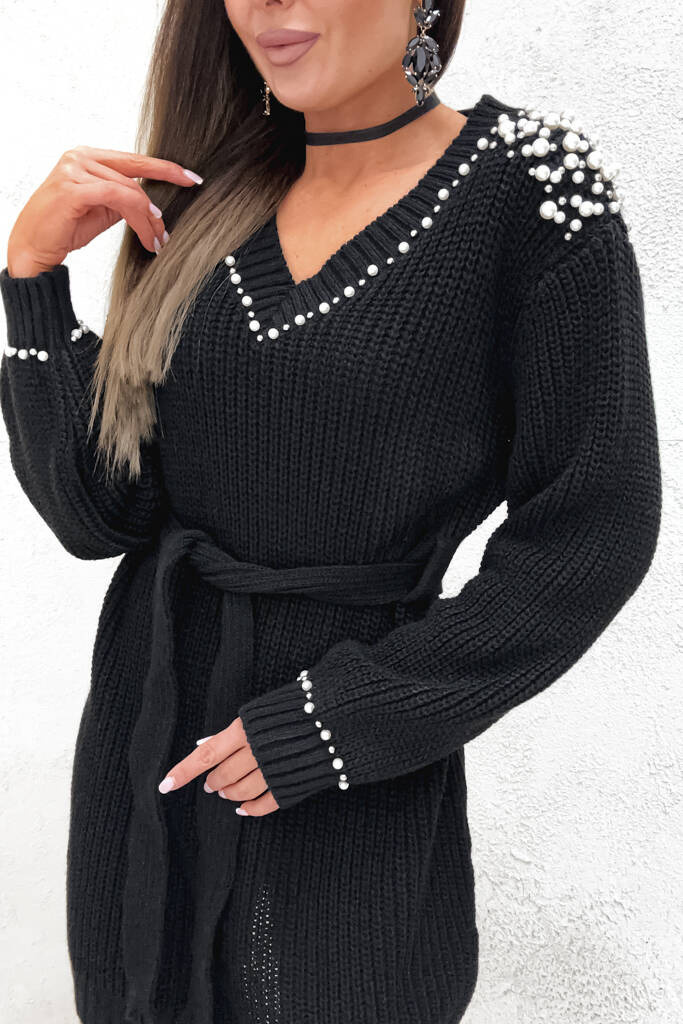 DŁUGI SWETER OVERSIZE Z KORALIKAMI I WIAZANIEM W PASIE- CZARNY