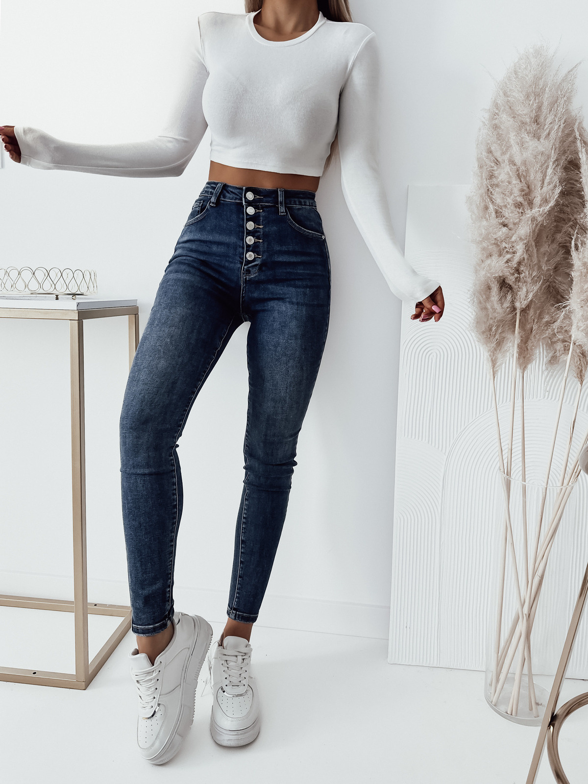 CIEMNE SPODNIE JEANSOWE Z GUZIKAMI- BARDZO WYSOKI STAN