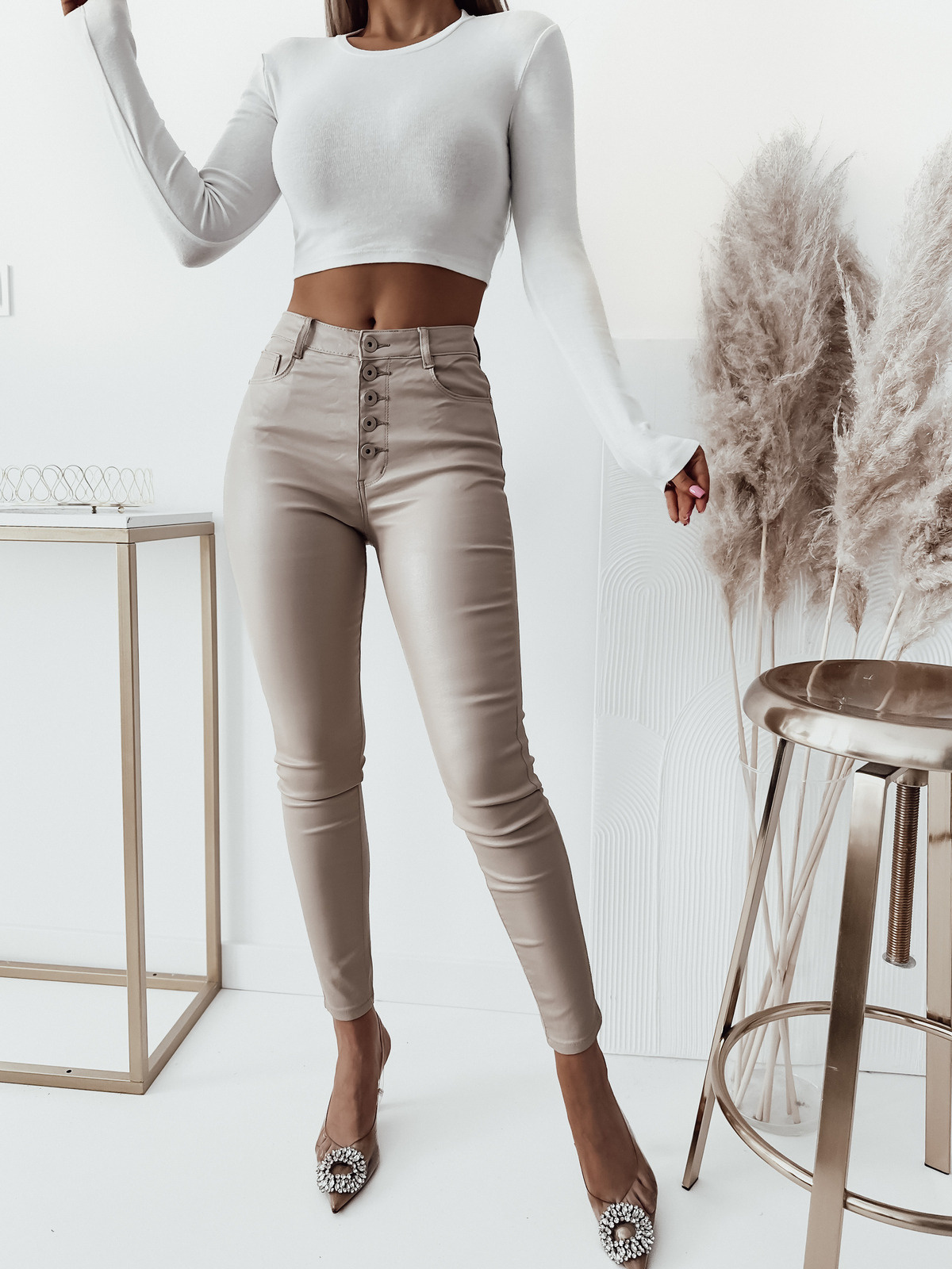 SPODNIE WOSKOWANE Z GUZIKAMI I WYSOKIM STANEM- BEŻOWE