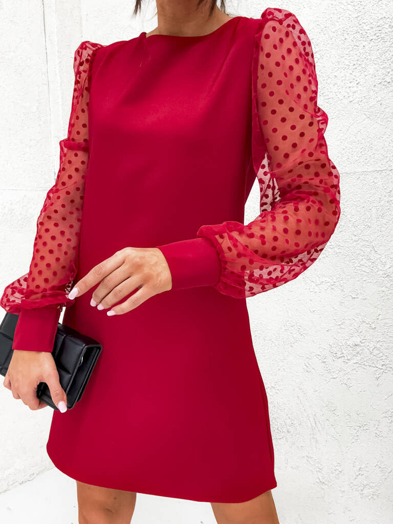 TRAPEZOWA SUKIENKA Z TIULOWYMI RĘKAWAMI W KROPKI- CZERWONA