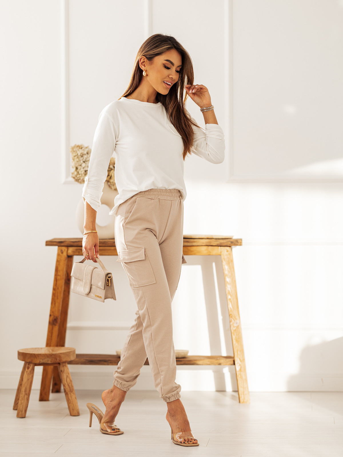 KOMPLET BLUZKA Z OZDOBNĄ KIESZONKĄ+ SPODNIE BOJÓWKI- BEŻOWY