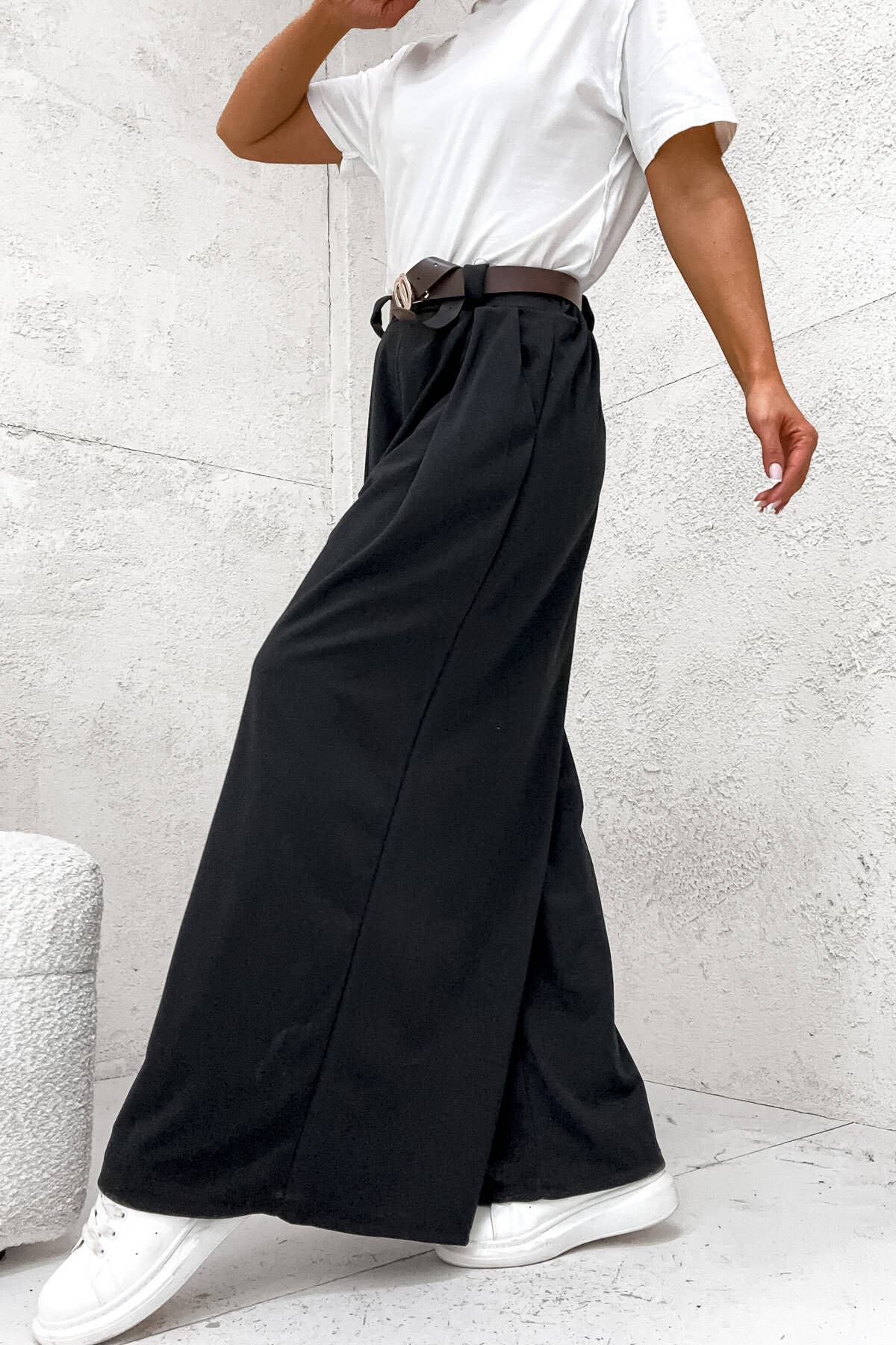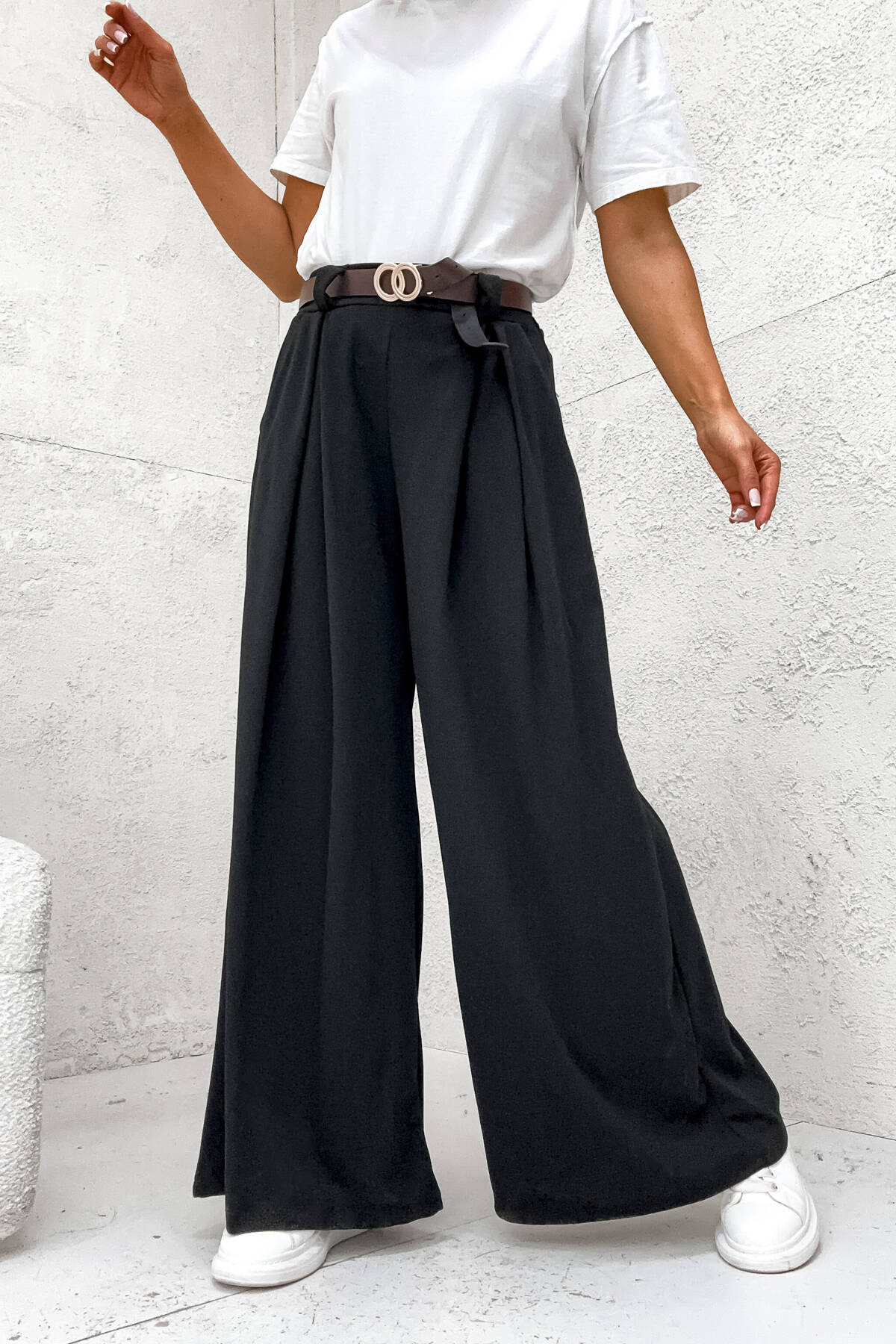 SZEROKIE SPODNIE ONESIZE Z WYSOKIM STANEM I PASKIEM- CZARNE