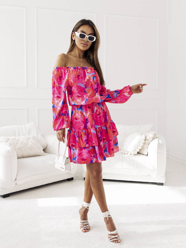 WZORZYSTA SUKIENKA MIDI Z GUMĄ W PASIE- FUKSJA