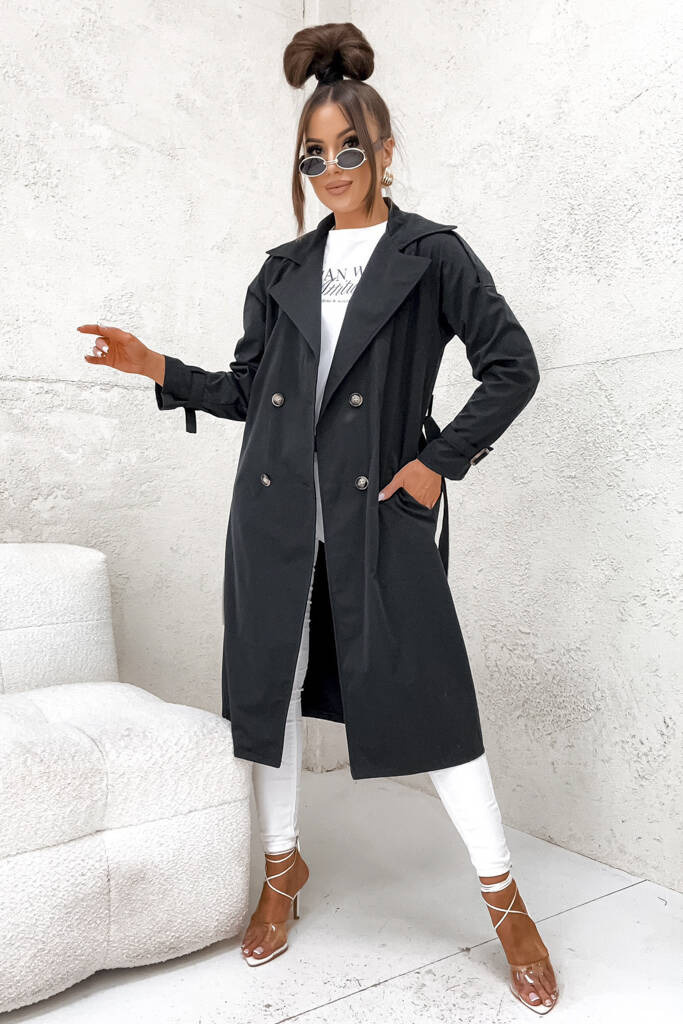 DŁUGI PŁASZCZ TRENCZ WIĄZANY W PASIE- CZARNY