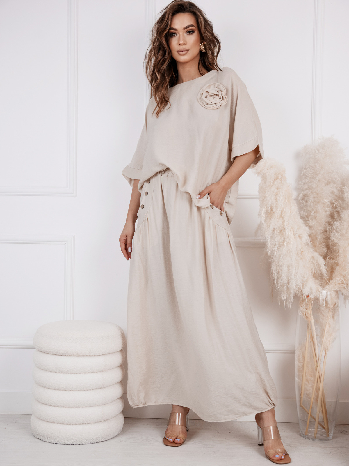 DZIANINOWY KOMPLET BLUZKA Z KWATEM+SPÓDNICA MAXI- BEŻOWY