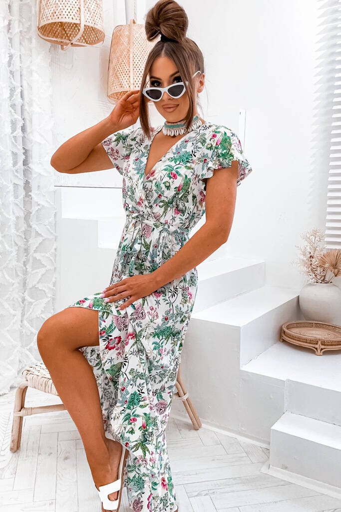 SUKIENKA MAXI W KWIATY Z ZAKŁADKĄ I PASKIEM-BIAŁA