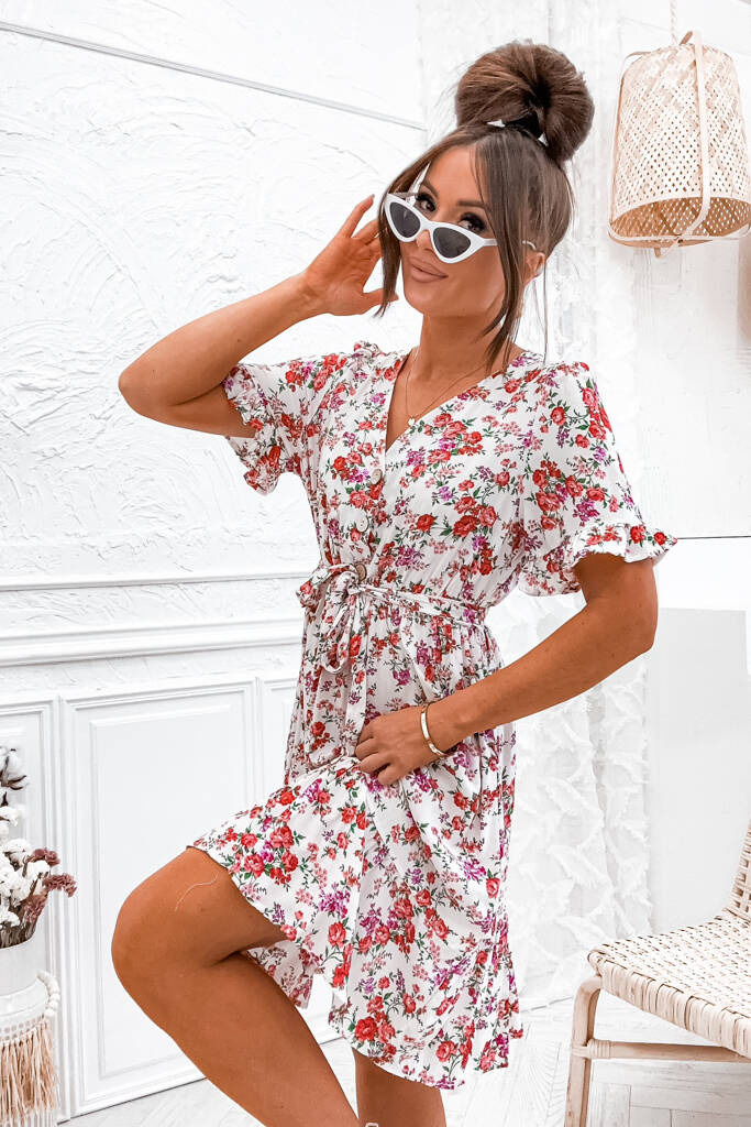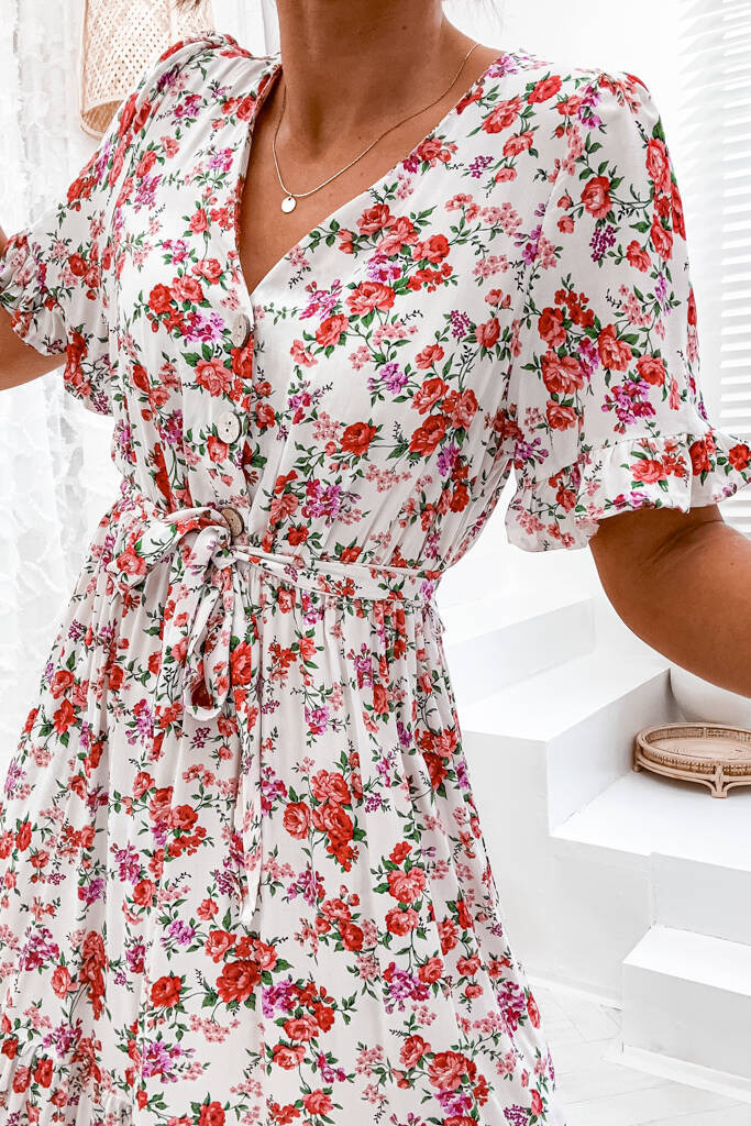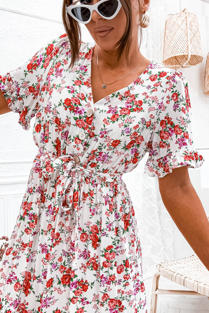 SUKIENKA MIDI W KWIATY Z DEKOLTEM NA GUZIKI+ PASEK- BIAŁA
