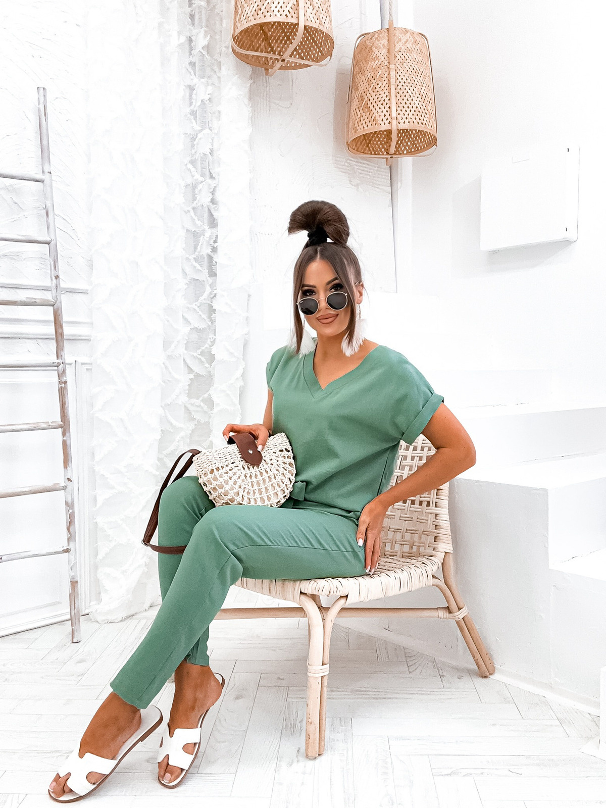 KOMPLET LNIANY BLUZKA+ SPODNIE Z PASKIEM- ZIELONY