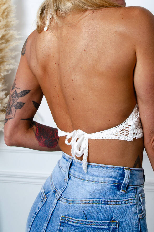 BIAŁY AŻUROWY USZTYWNIANY TOP WIĄZANY NA PLECACH BOHO