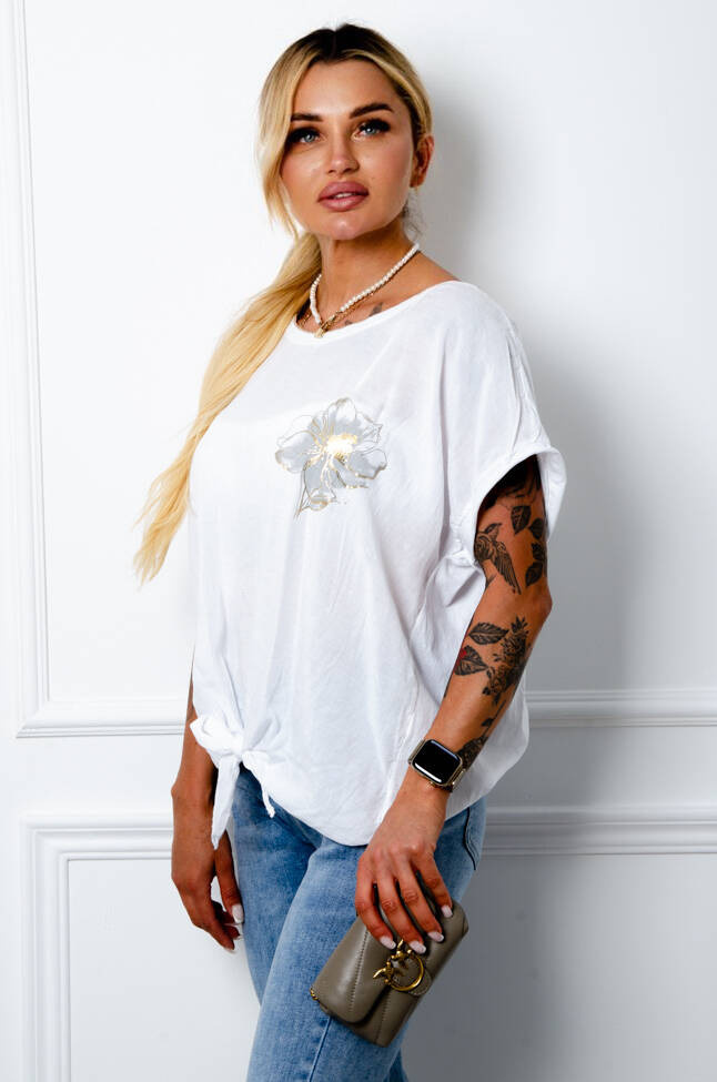 BLUZKA Z KWIATEM I WIĄZANIEM NA DOLE- BIAŁA