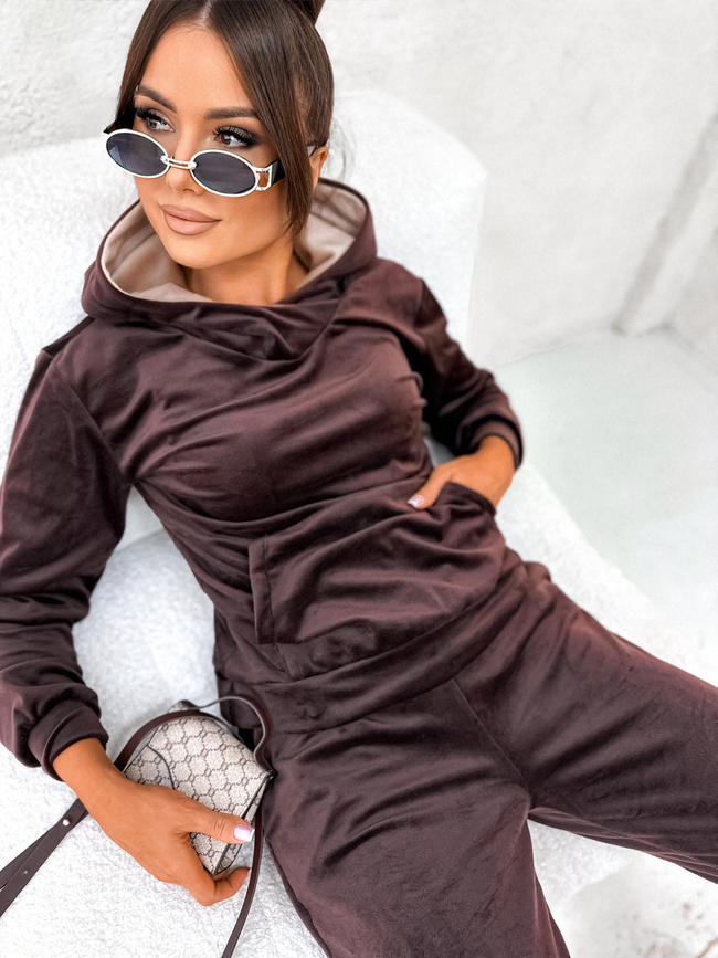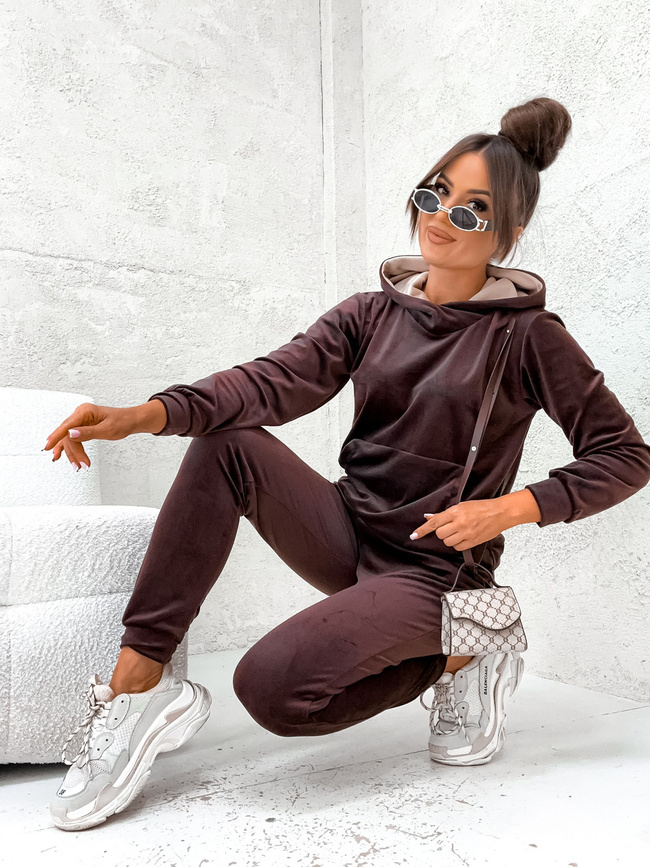 WELUROWY KOMPLET DRESOWY BLUZA Z KAPTUREM+ SPODNIE- CZEKOLADOWY