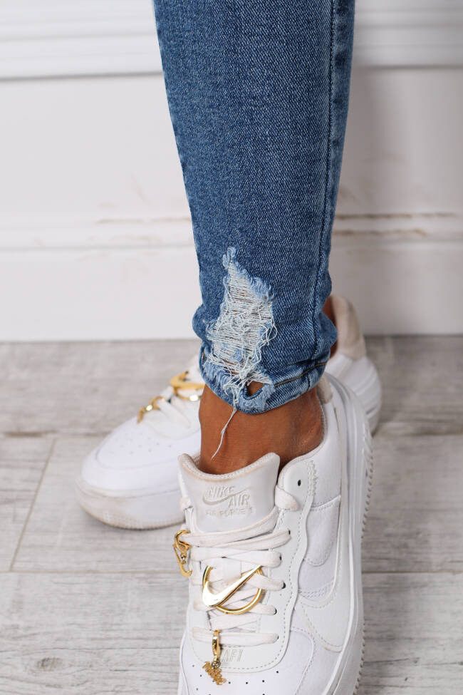 Dżinsy z 5 kieszeniami wykonane z denimu o dużej elastyczności zapewniającego doskonałą wygodę. Obcisły fason od talii do samego dołu. Wysoki stan, rozporek na suwak i guzik. Posiadają ozdobne dziury i przetarcia