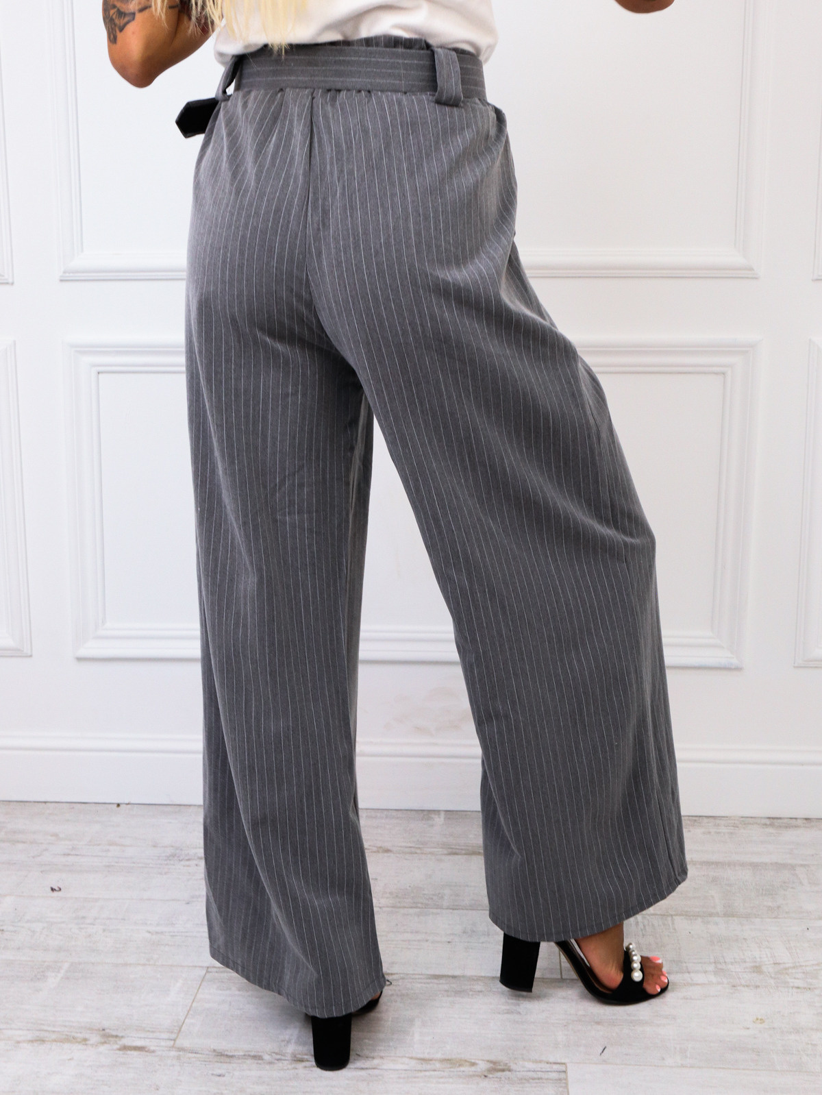 ELEGANCKIE SPODNIE W PASKI Z SZEROKĄ NOGAWKĄ+ PASEK- SZARE