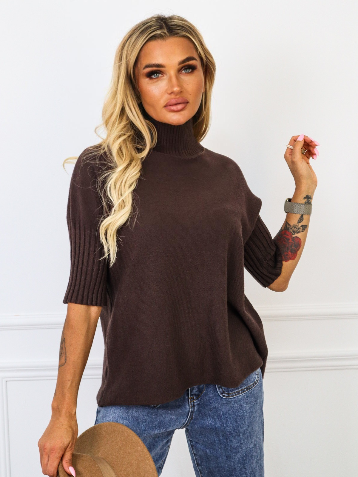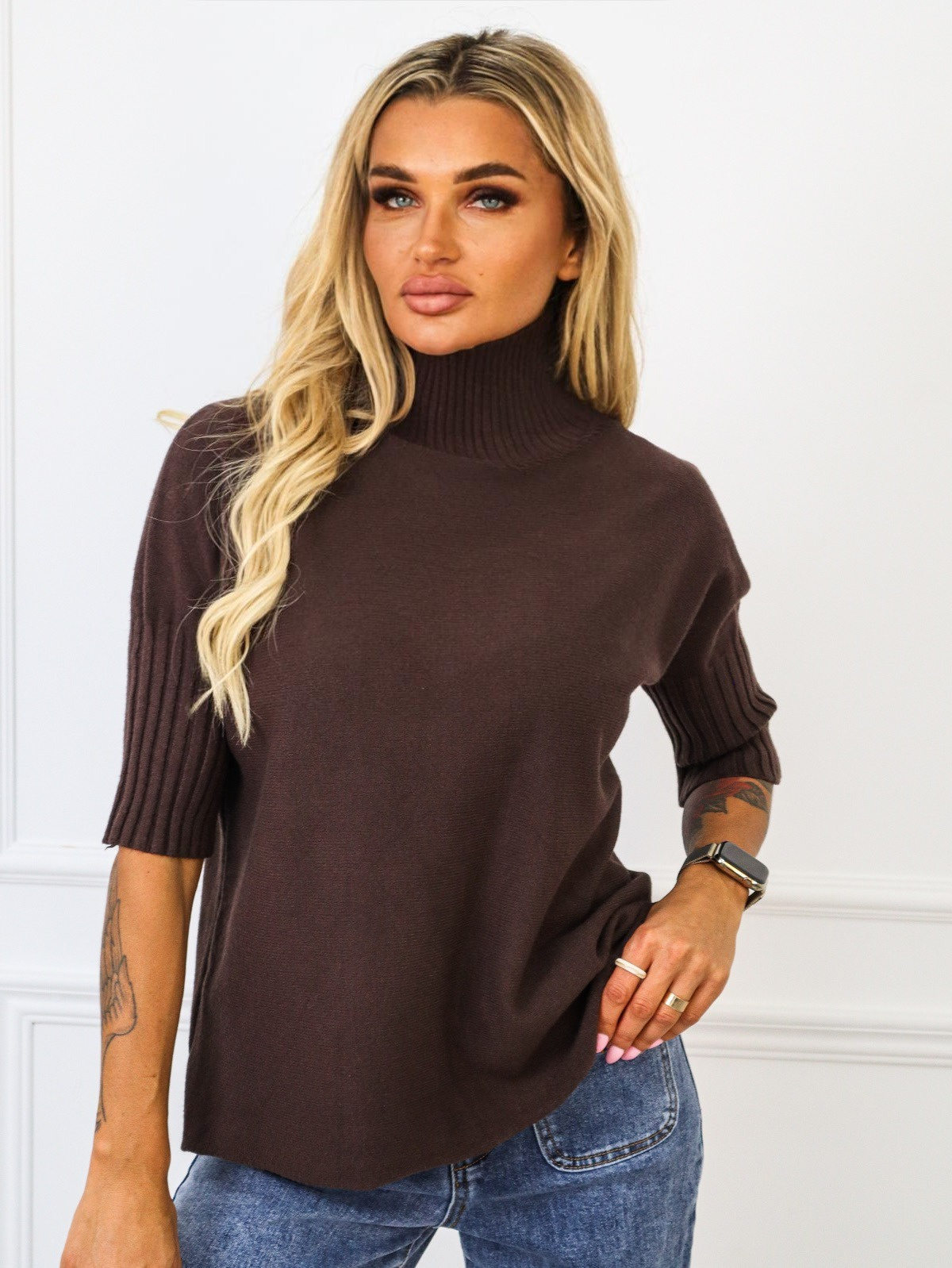 SWETER Z KRÓTKIM RĘKAWEM I GOLFEM- BRĄZOWY