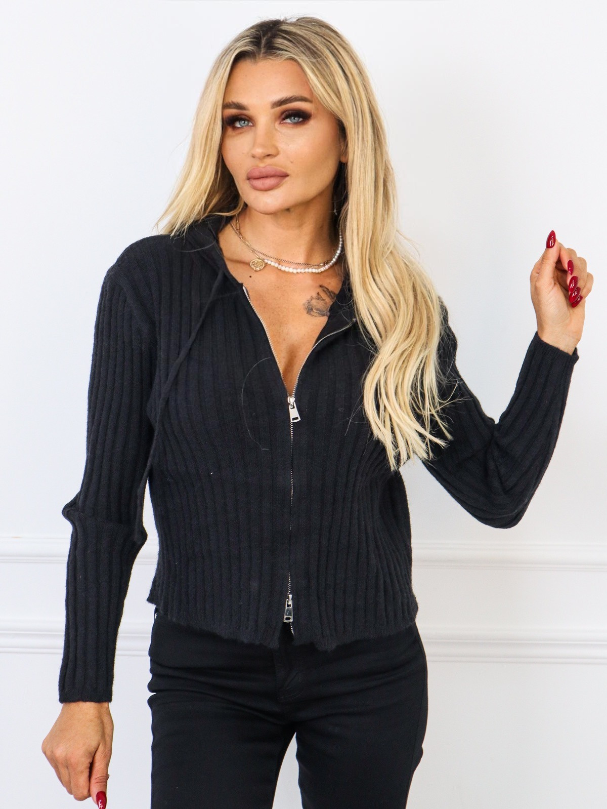 DZIANINOWA BLUZA W PRĄŻEK Z KAPUREM NA SUWAK- CZARNA