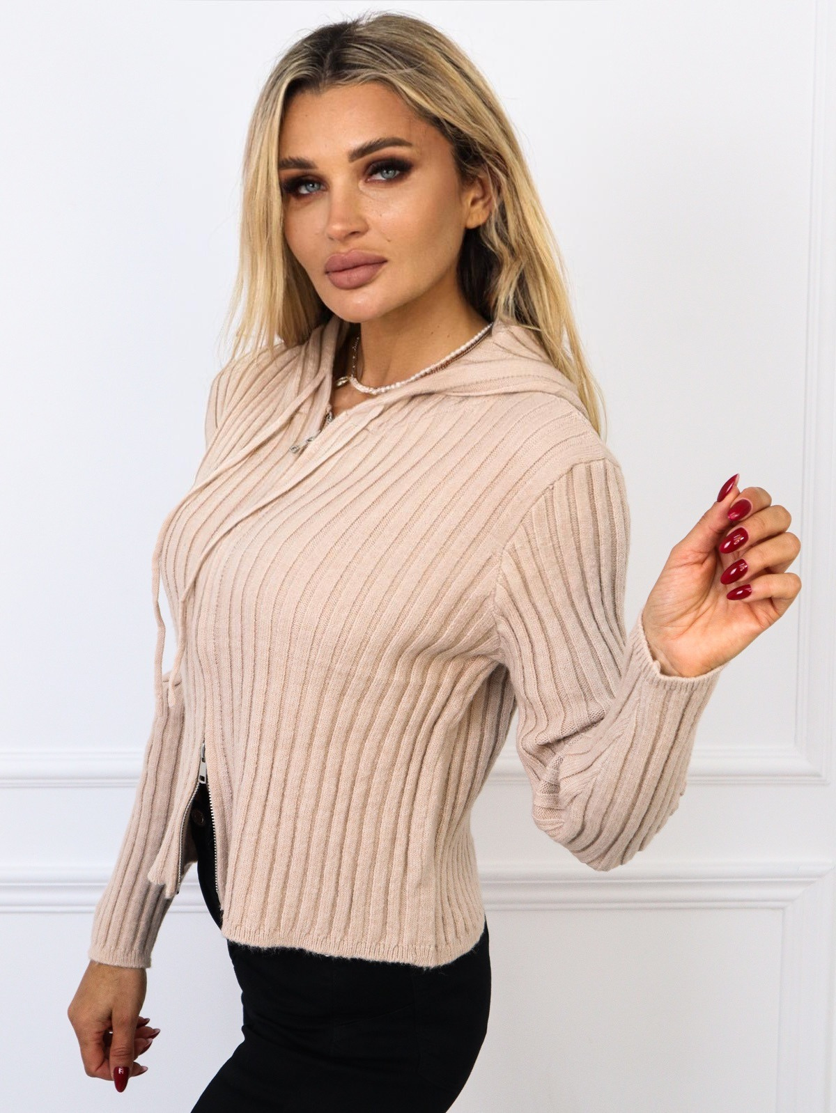 DZIANINOWA BLUZA W PRĄŻEK Z KAPUREM NA SUWAK- BRĄZOWA