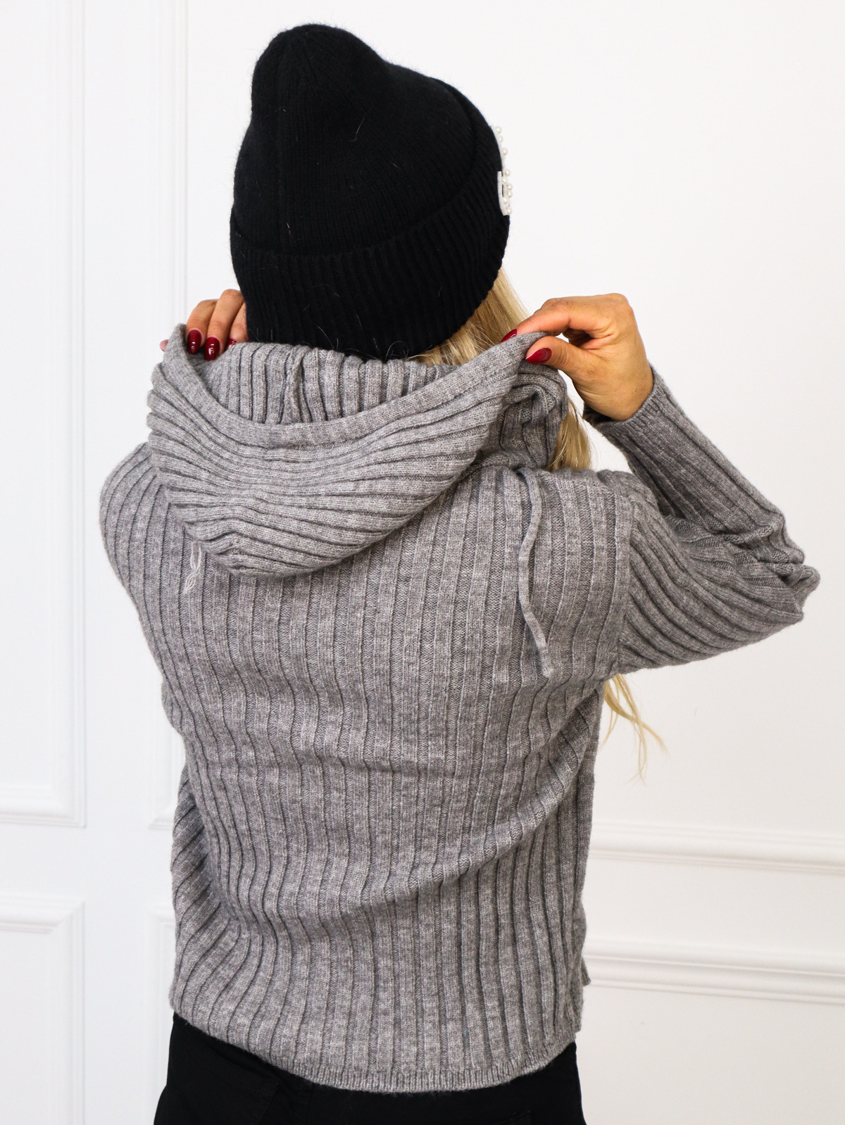 DZIANINOWA BLUZA W PRĄŻEK Z KAPUREM NA SUWAK- SZARA