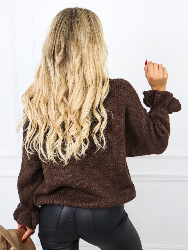 SWETER PLECIONY RĘKAW ZAKOŃCZONY FALBANĄ- CIEMNO BRĄZOWY