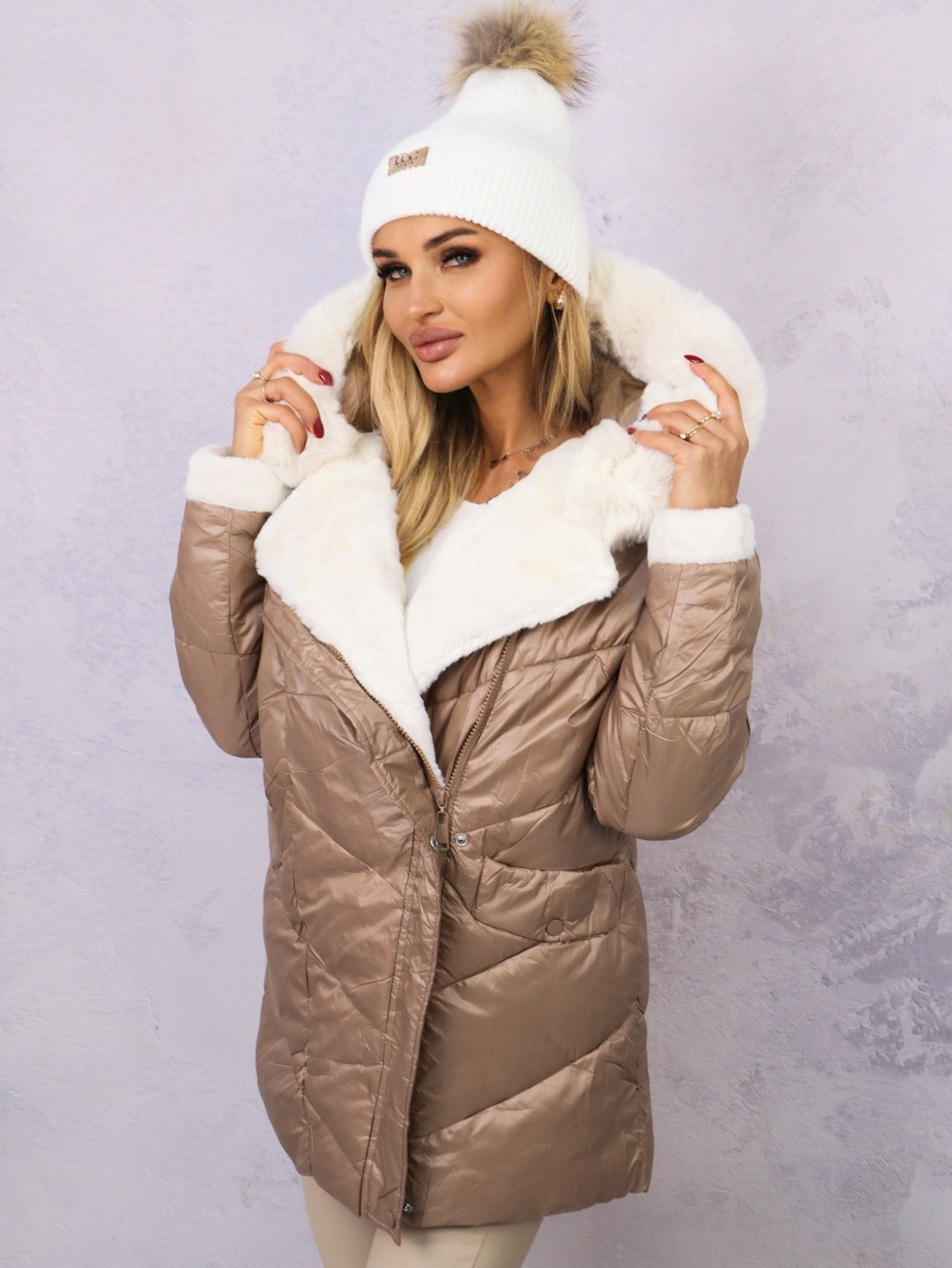 KURTKA PIKOWANA PUCHOWA Z FUTERKIEM NA RĘKAWACH- BRĄZOWA