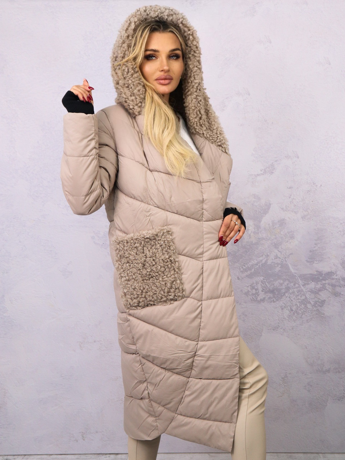 DŁUGA KURTKA Z FUTRZANYM KAPTUREM I KIESZENIAMI- BEŻOWA