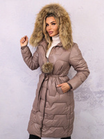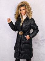 Długa, pikowana kurtka. Zapinana na zamek i zatrzaski. Futerko odpinane.