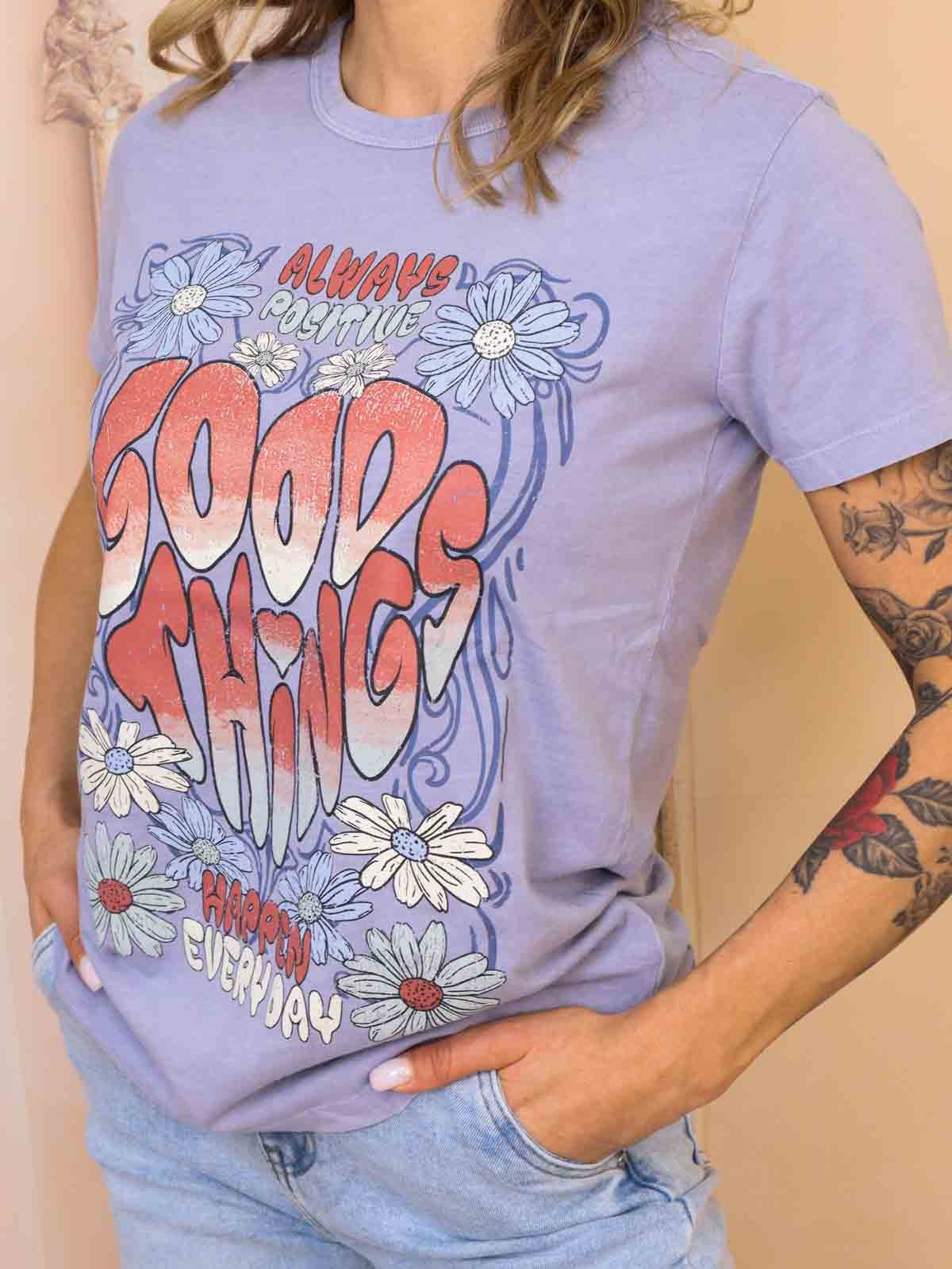 NIEBIESKI DEKATYZOWANY T-SHIRT Z PRINTEM