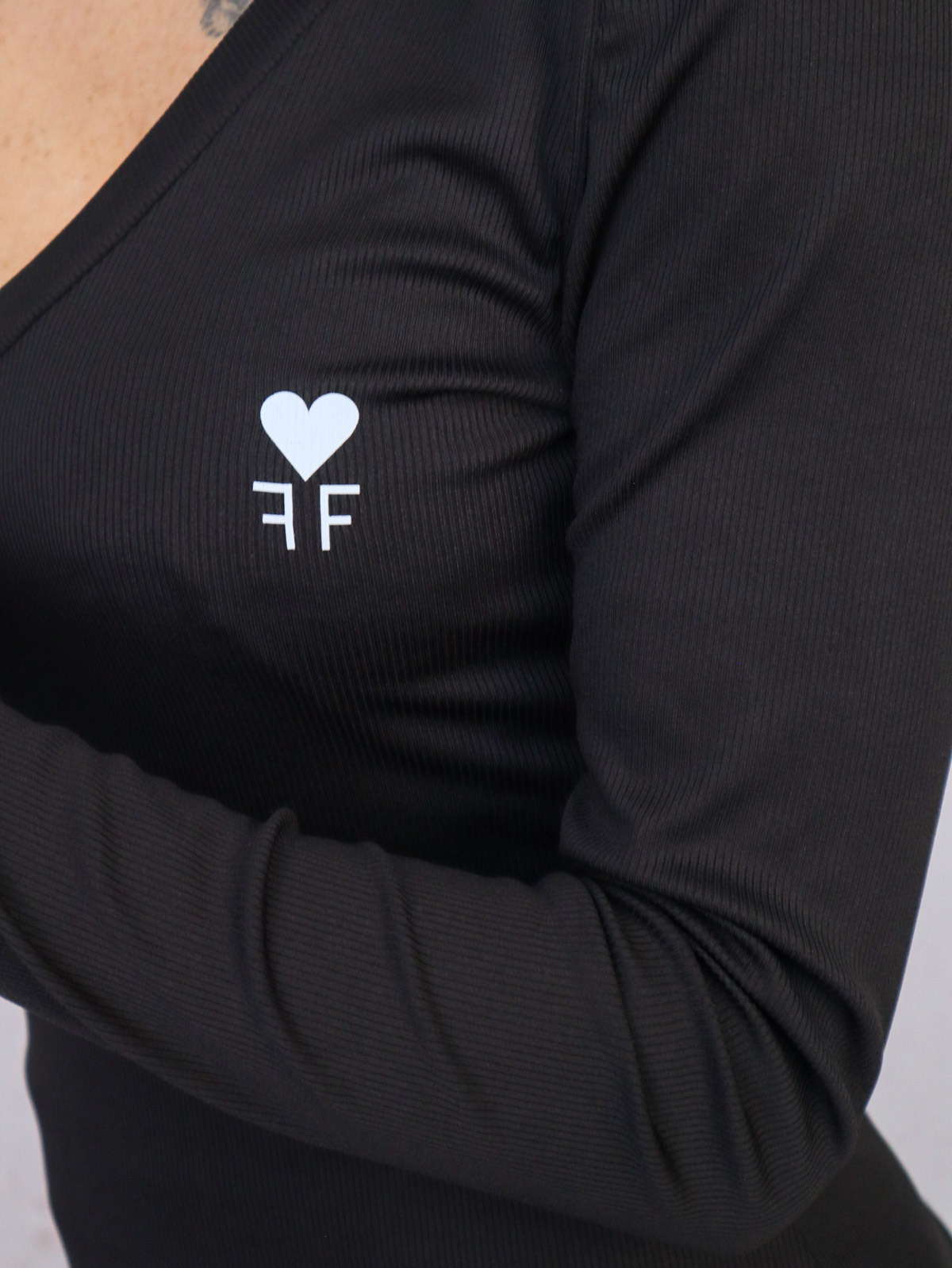 Model o klasycznym fasonie z kobiecym dekoltem w serek i długimi rękawami. Całość wykonana została z prążkowanego materiału, dzięki czemu doskonale dopasowuje się do sylwetki.
