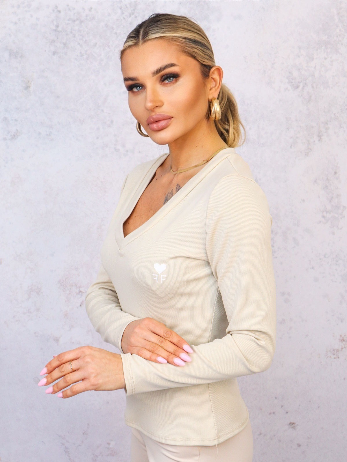 BLUZKA PRĄŻKOWANA Z DEKOLTEM W SZPIC I OZDOBNĄ APLIKACJĄ- BEŻOWA