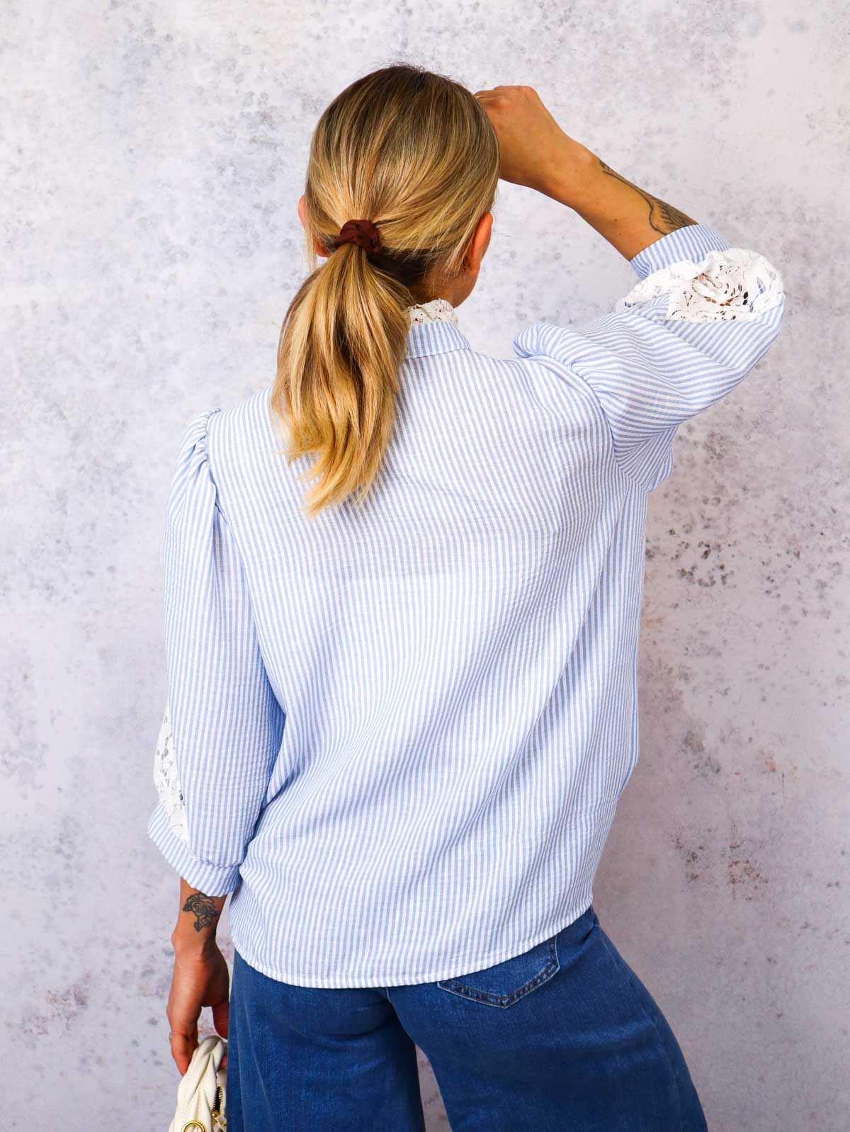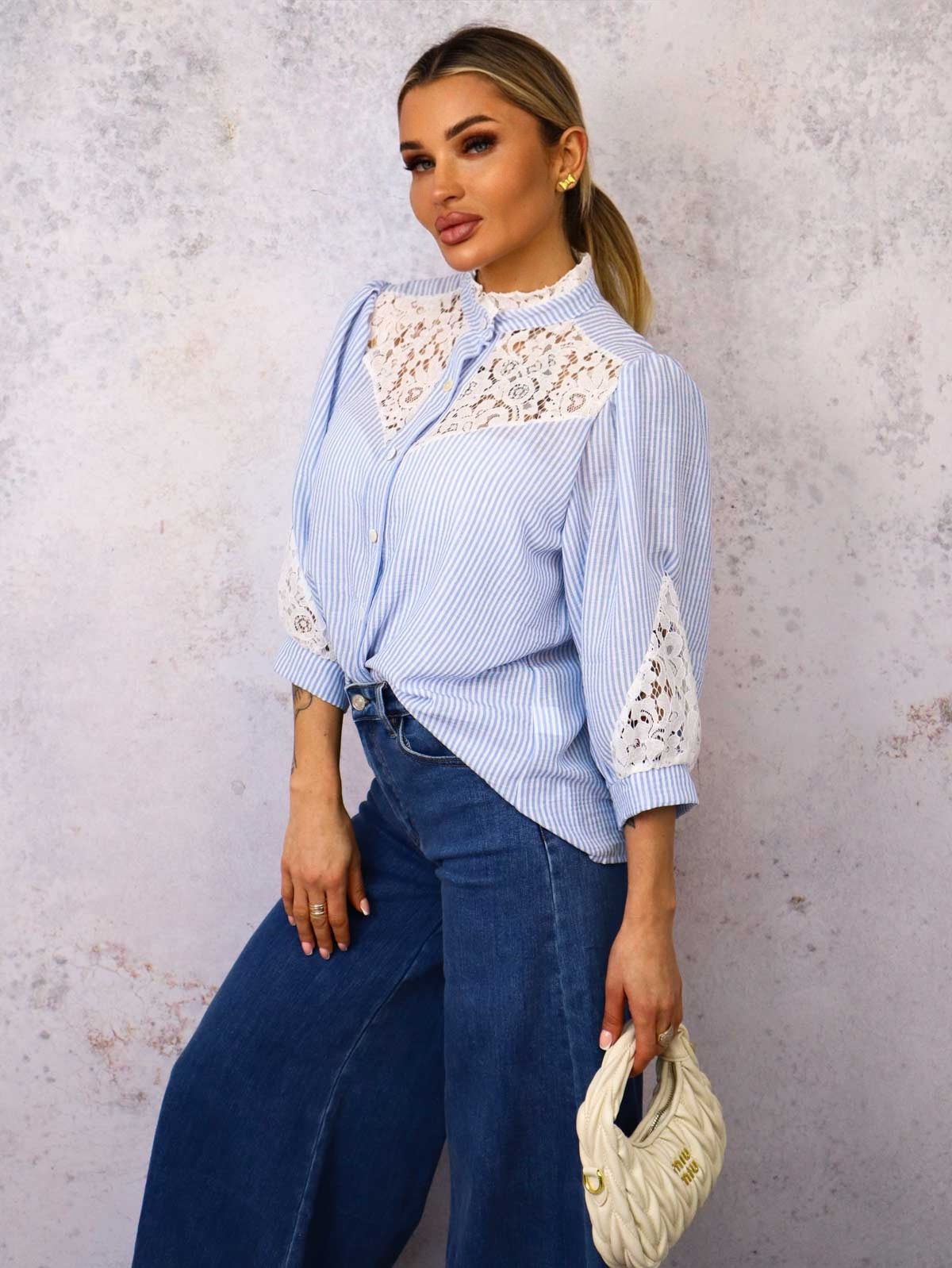 KOSZULA W PASKI Z OZDOBNĄ KORONKĄ- NIEBIESKA