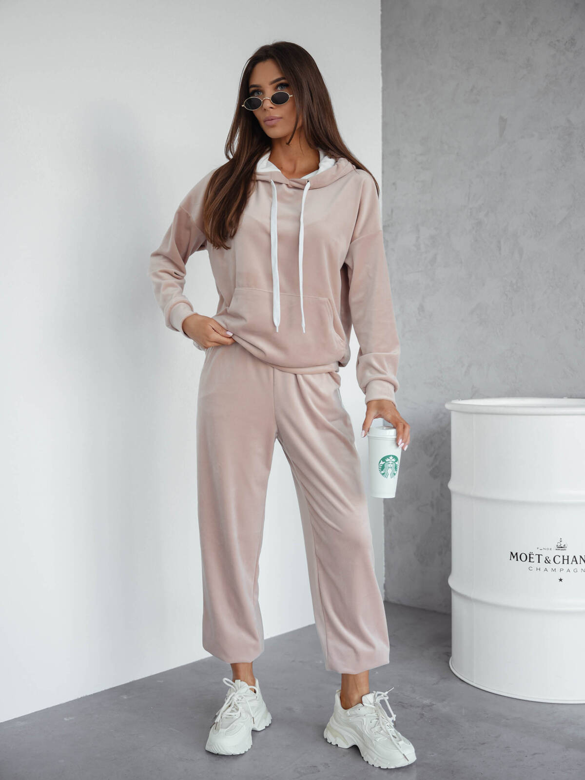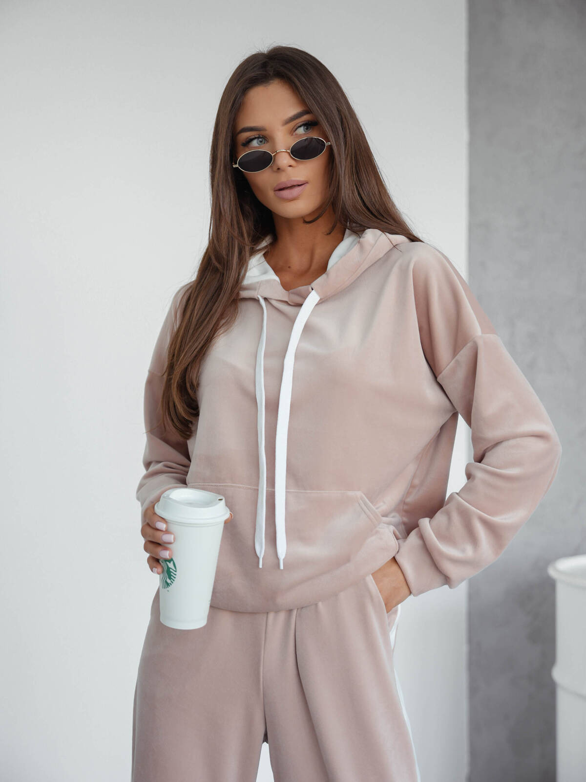 KOMPLET WELUROWY BLUZA+ SPODNIE Z KONTRASTOWYMI LAMPASAMI- BEŻOWY