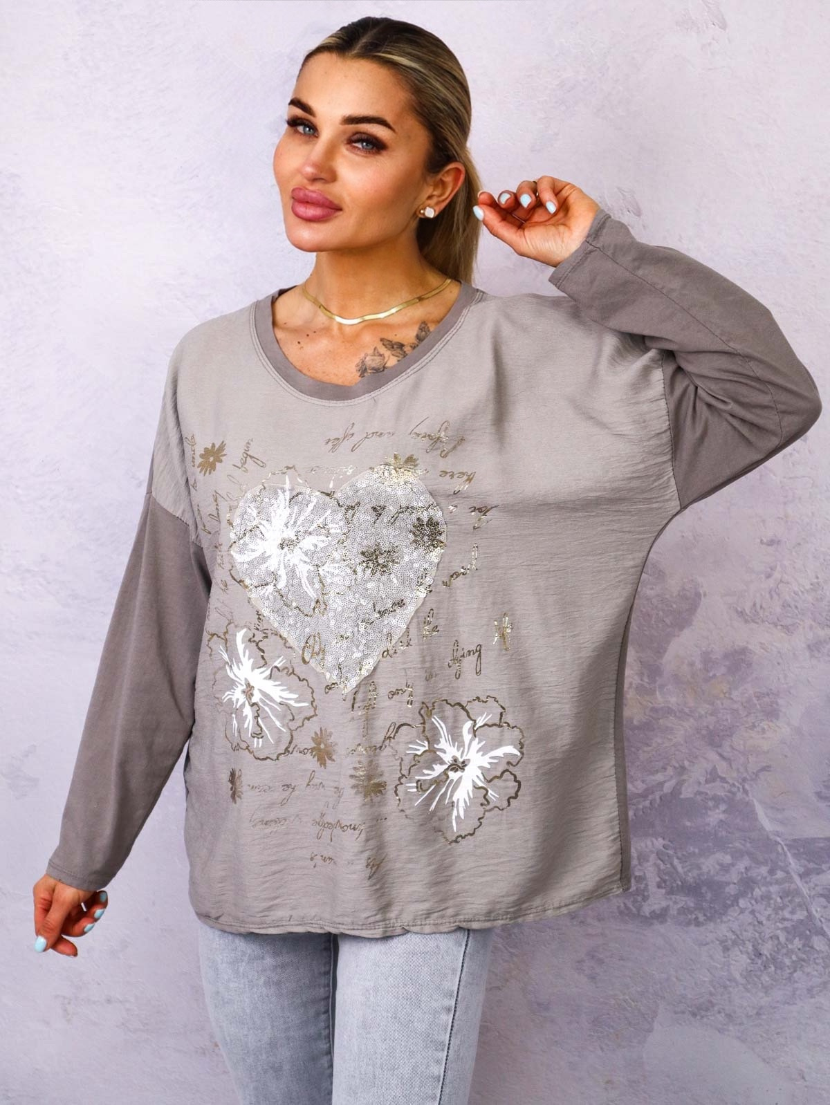 BLUZKA Z APLIKACJĄ I OZDOBNYMI CEKINAMI- SZARA
