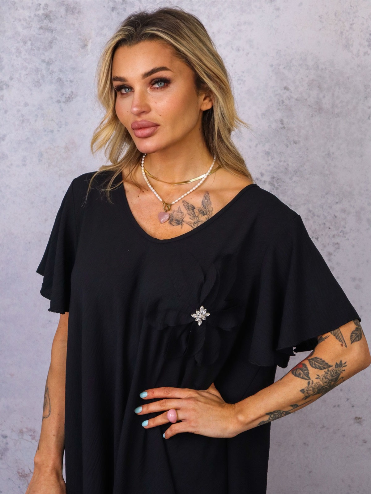 SUKIENKA Z KWIATEM I FALBANAMI NA RĘKAWACH- CZARNA