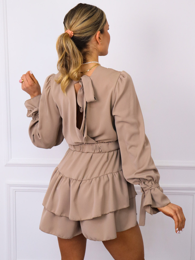 KOMBINEZON Z FALBANAMI WIĄZANY NA PLECACH- BRĄZOWY