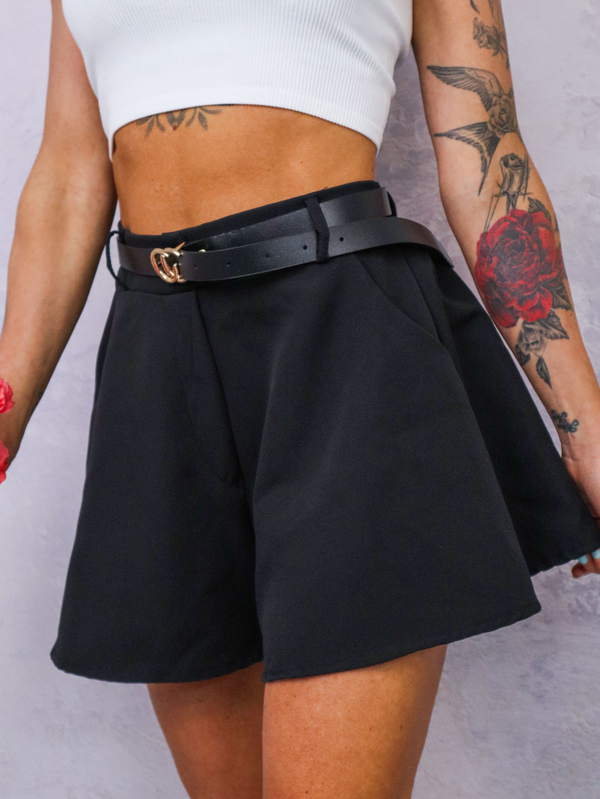 SZORTY MATERIAŁOWE Z SZEROKIMI NOGAWKAMI+ PASEK- CZARNE