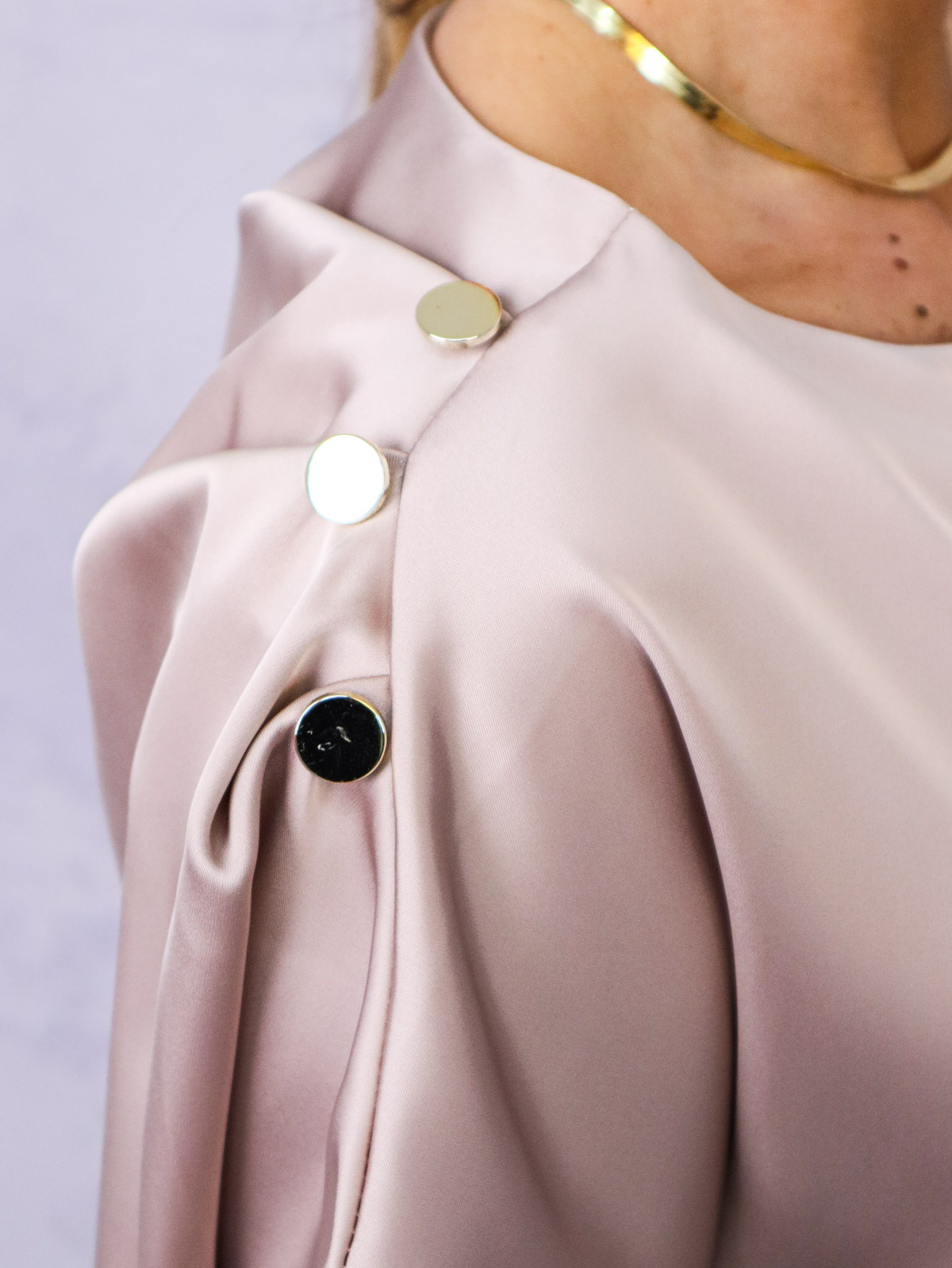 SATYNOWA BLUZKA Z OZDOBNYMI GUZIKAMI NA RAMIENIU- BEŻOWA