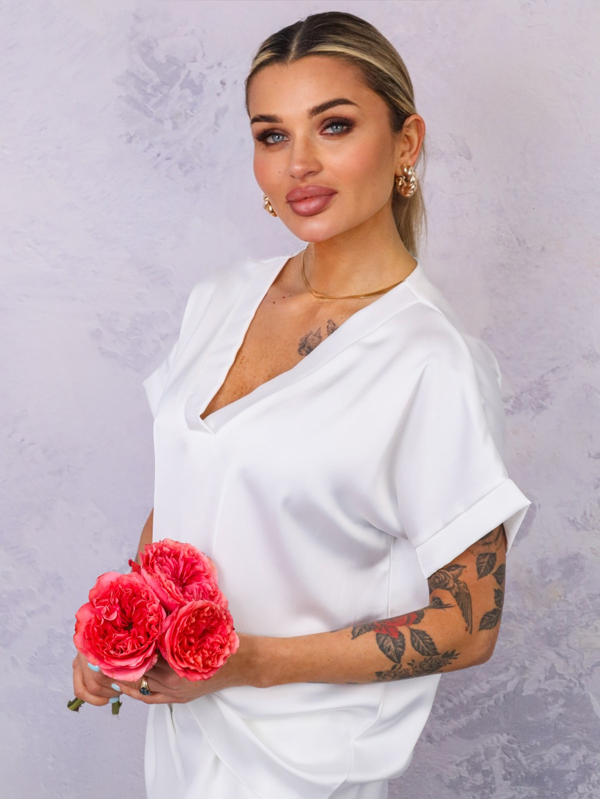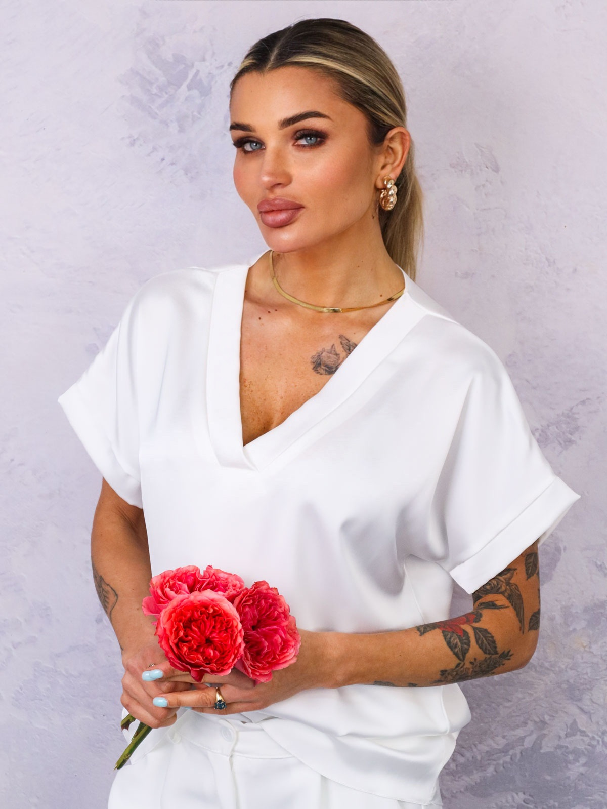 BLUZKA SATYNOWA Z DEKOLTEM W SEREK- BIAŁA