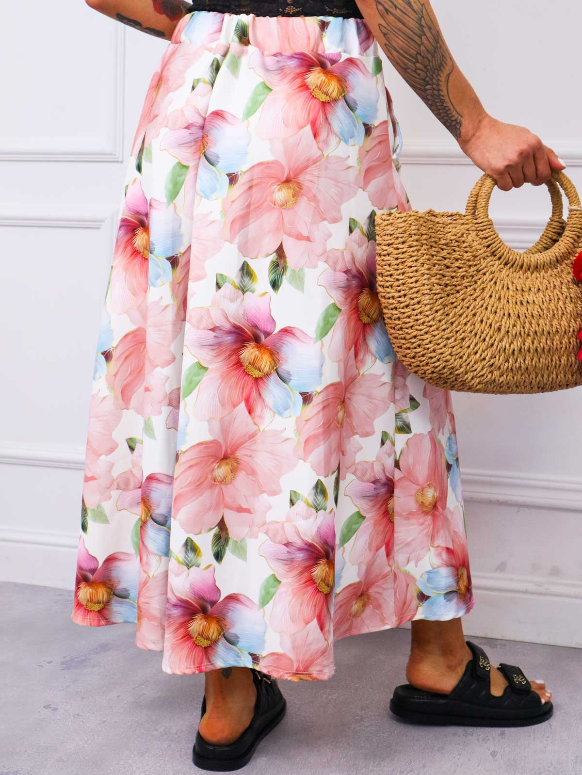 SPÓDNICA MIDI W KWIATY- RÓŻOWA