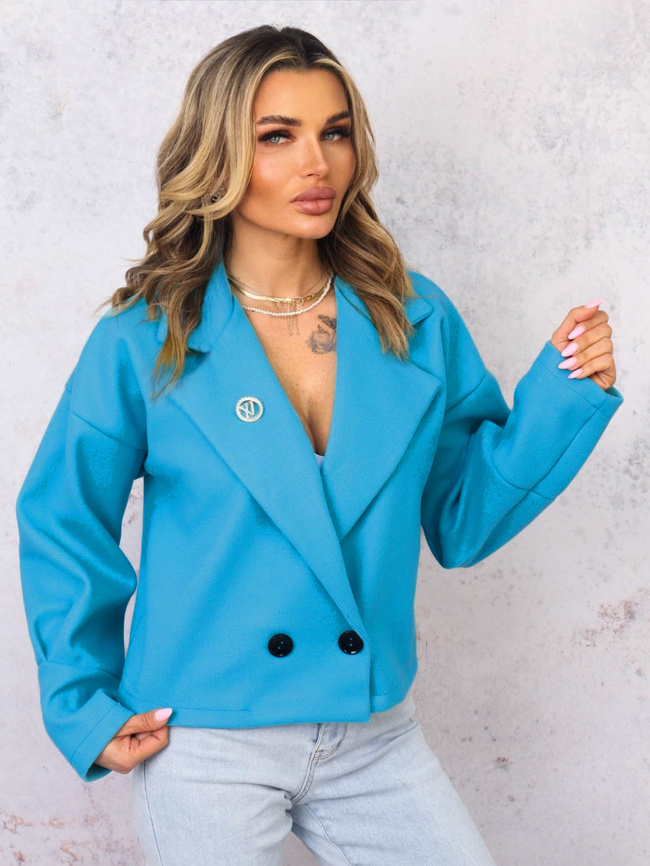 KRÓTKI PŁASZCZ Z KOŁNIERZEM I OZDOBNĄ BROSZKĄ- NIEBIESKI