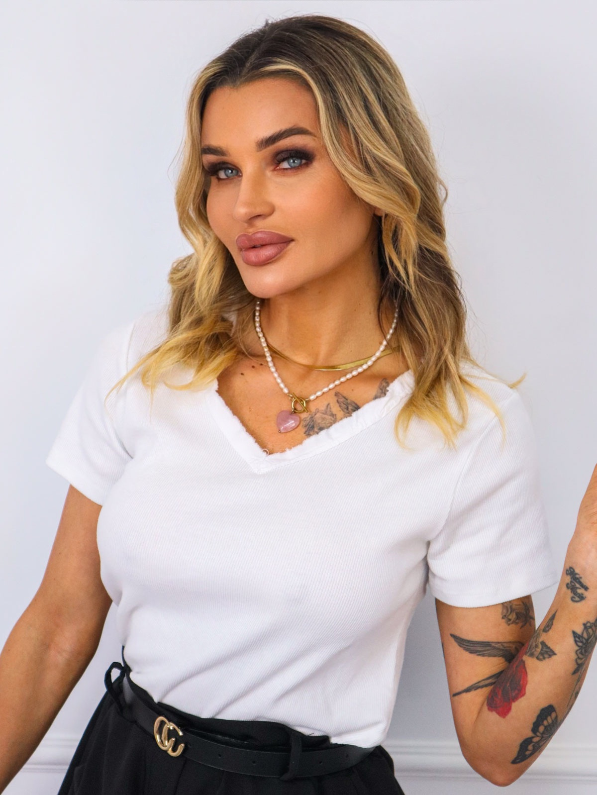 T-SHIRT PRĄŻKOWANY Z SZARPANYM DEKOLTEM- BIAŁY