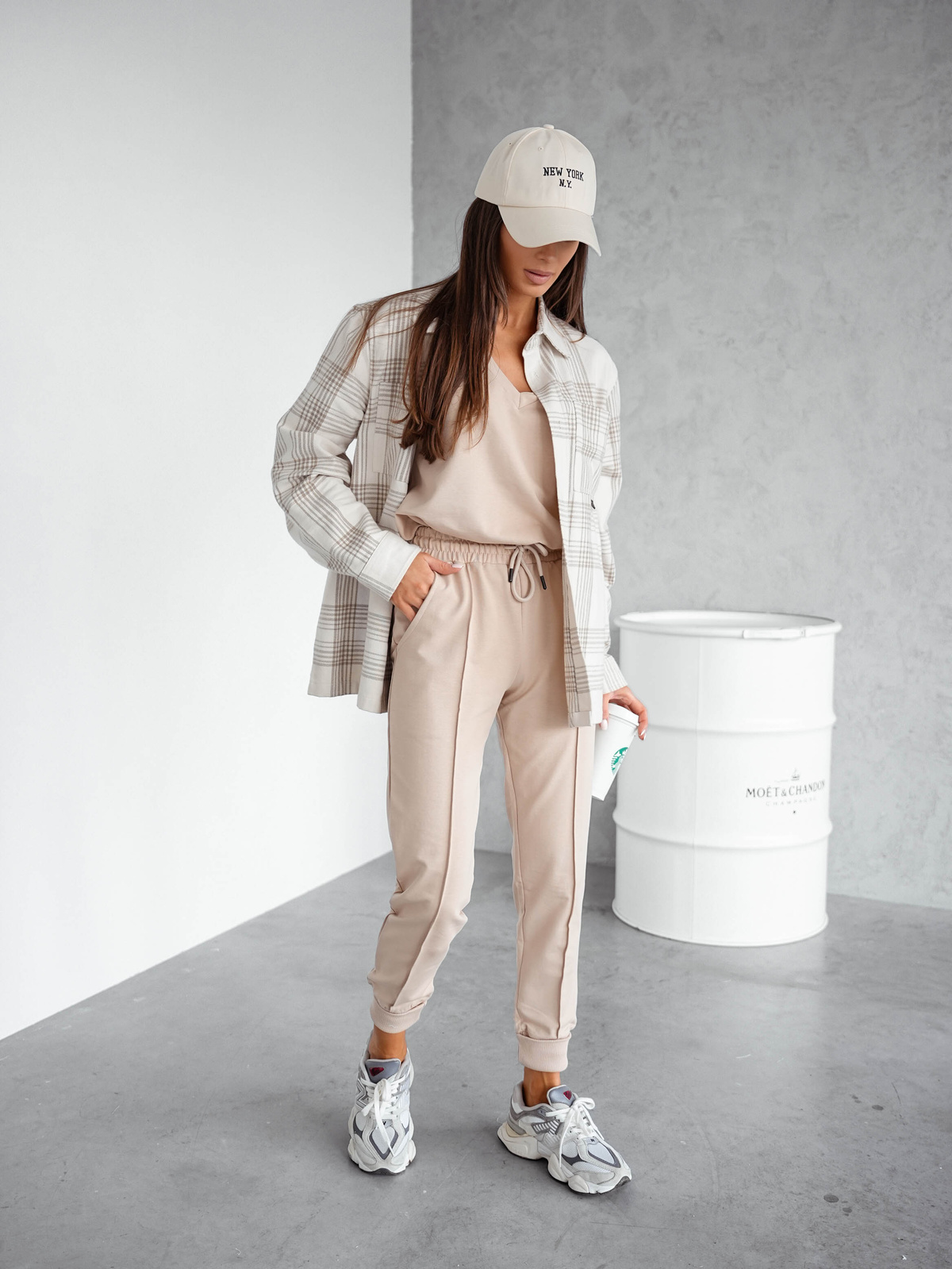 KOMPLET DRESOWY T-SHIRT+ SPODNIE Z PRZESZYCIEM- CIEMNY BEŻ