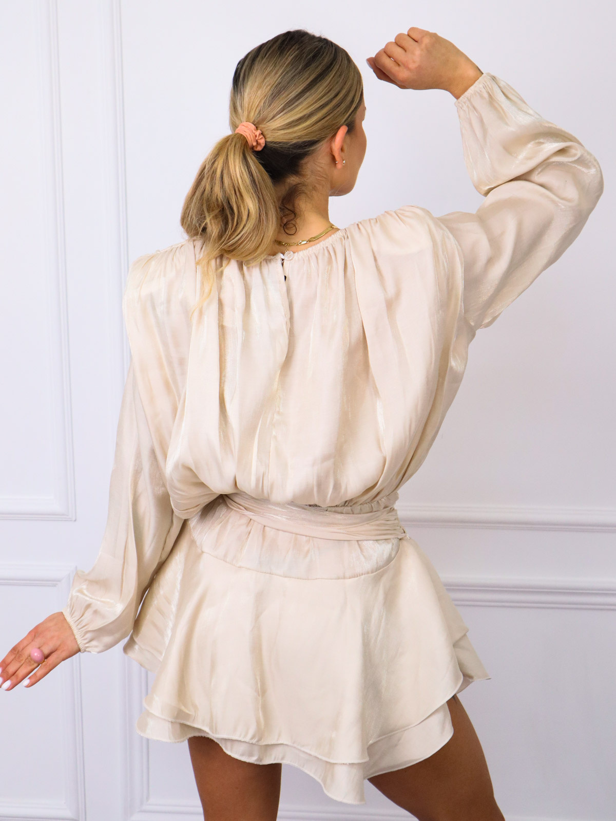 SUKIENKA Z FALBANAMI Z POŁYSKUJĄCEGO MATERIAŁU- BEŻOWA