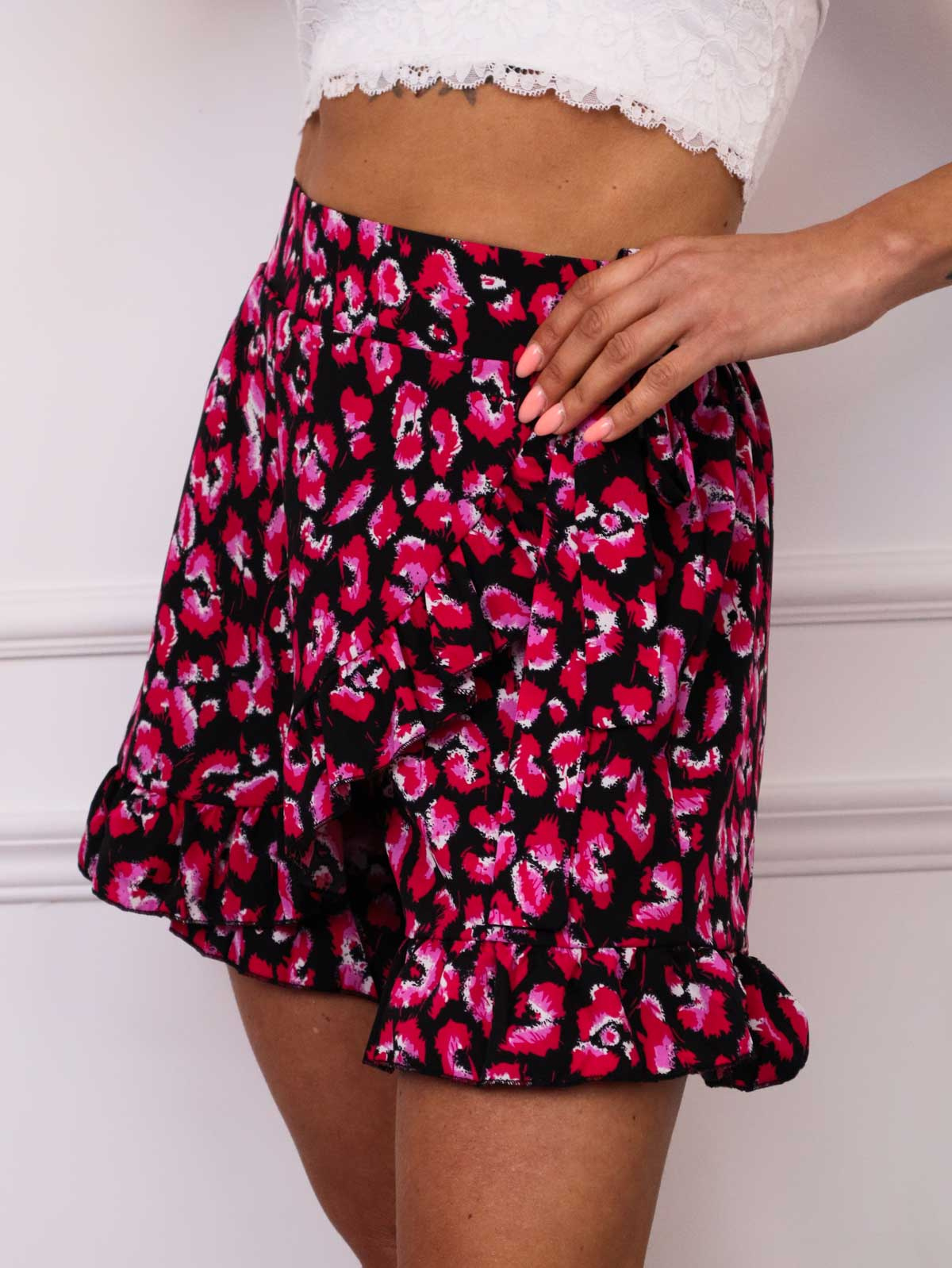SPÓDNICO-SPODENKI W PANTERKĘ Z FALBANAMI I WIĄZANIEM W PASIE- FUKSJA
