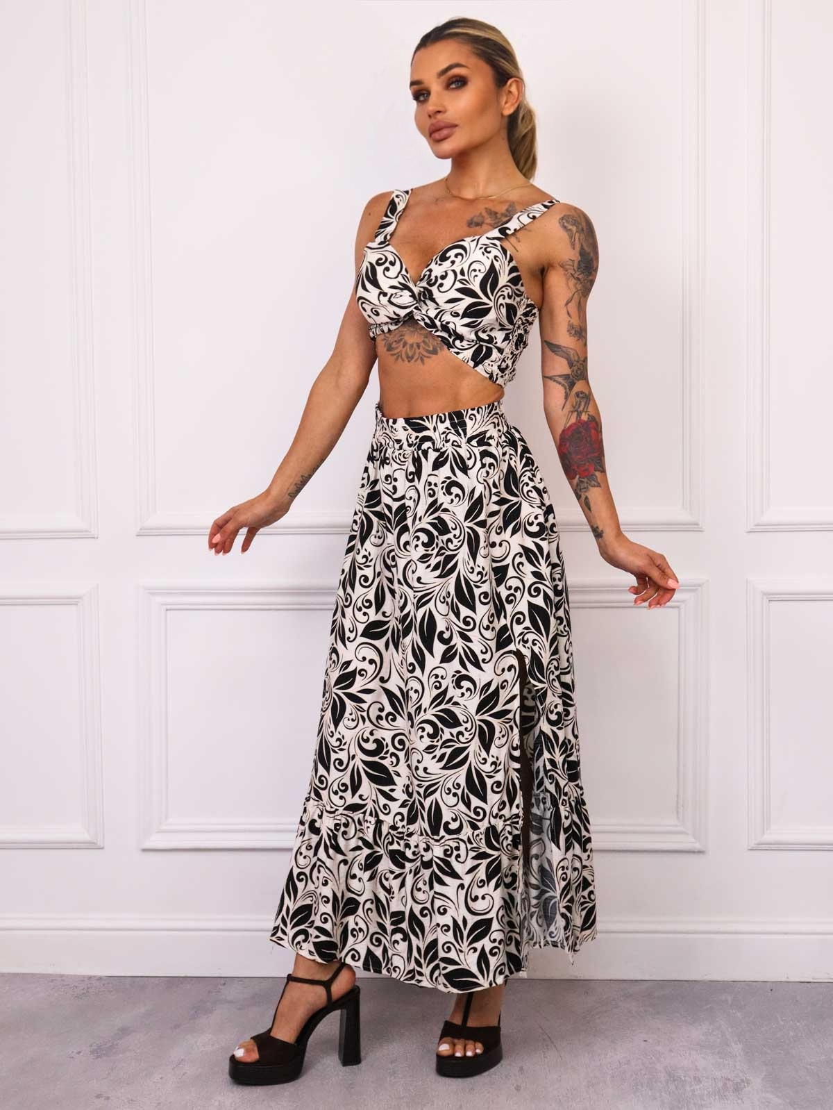 KOMPLET WZORZYSTY TOP+ SPÓDNICA Z ROZCIĘCIEM- CZARNY