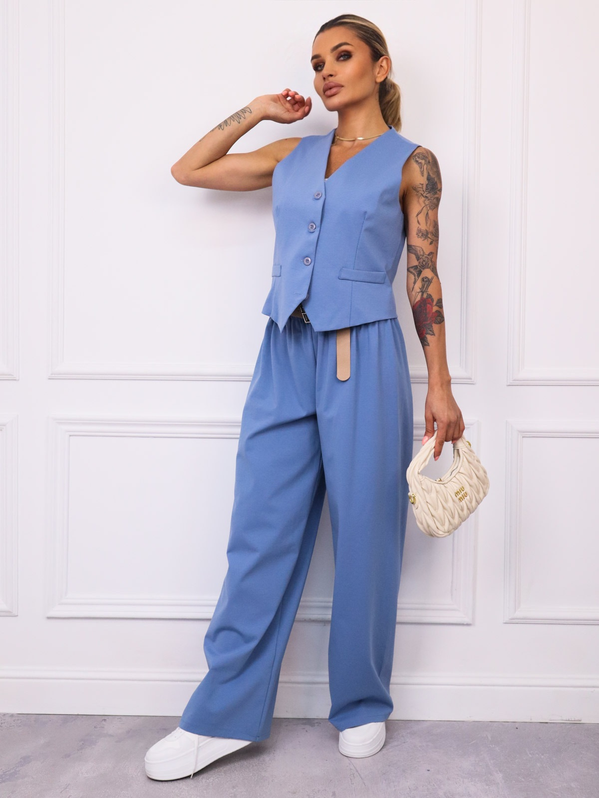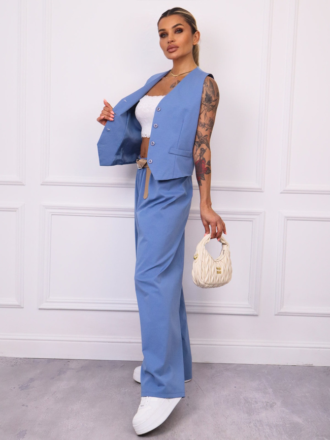 KOMPLET KAMIZELKA+ SPODNIE Z SZEROKIMI NOGAWKAMI I PASKIEM- NIEBIESKI