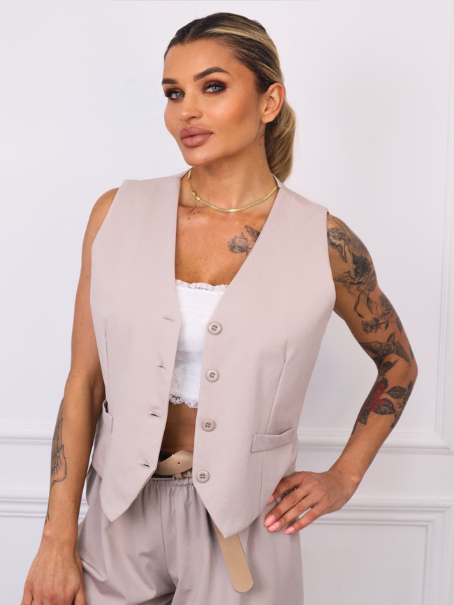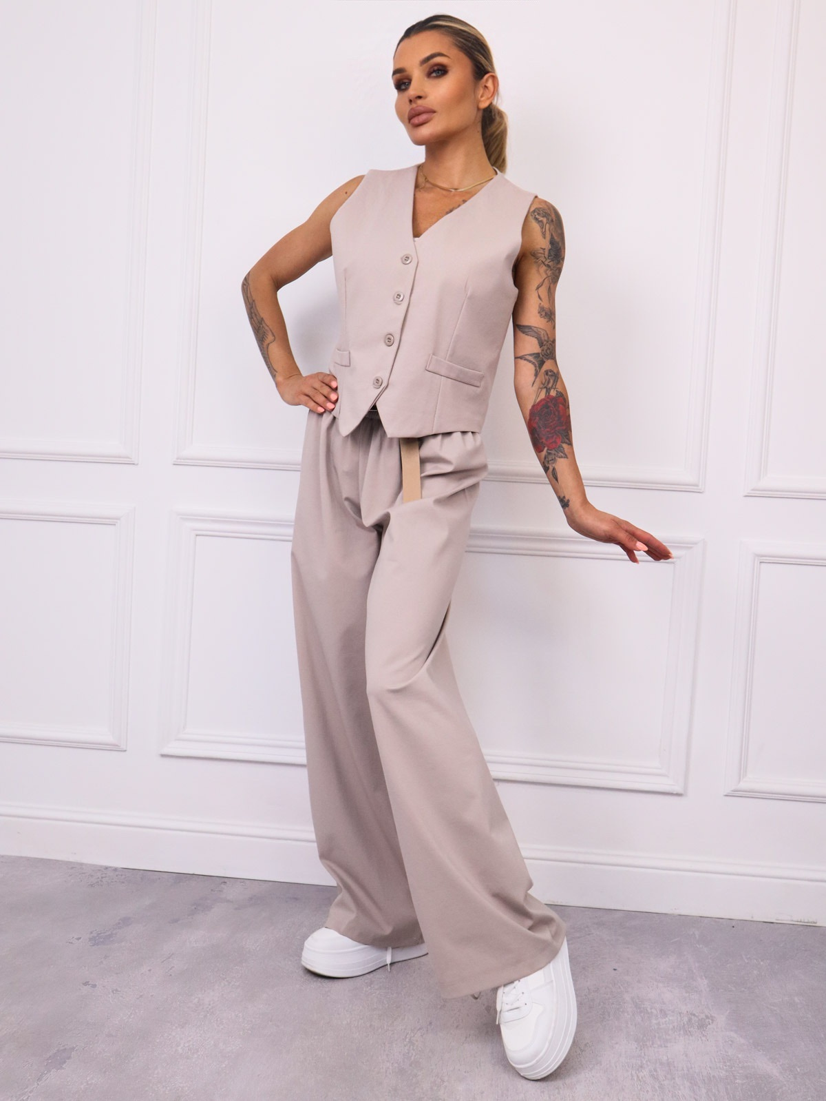 KOMPLET KAMIZELKA+ SPODNIE Z SZEROKIMI NOGAWKAMI I PASKIEM- BEŻOWY
