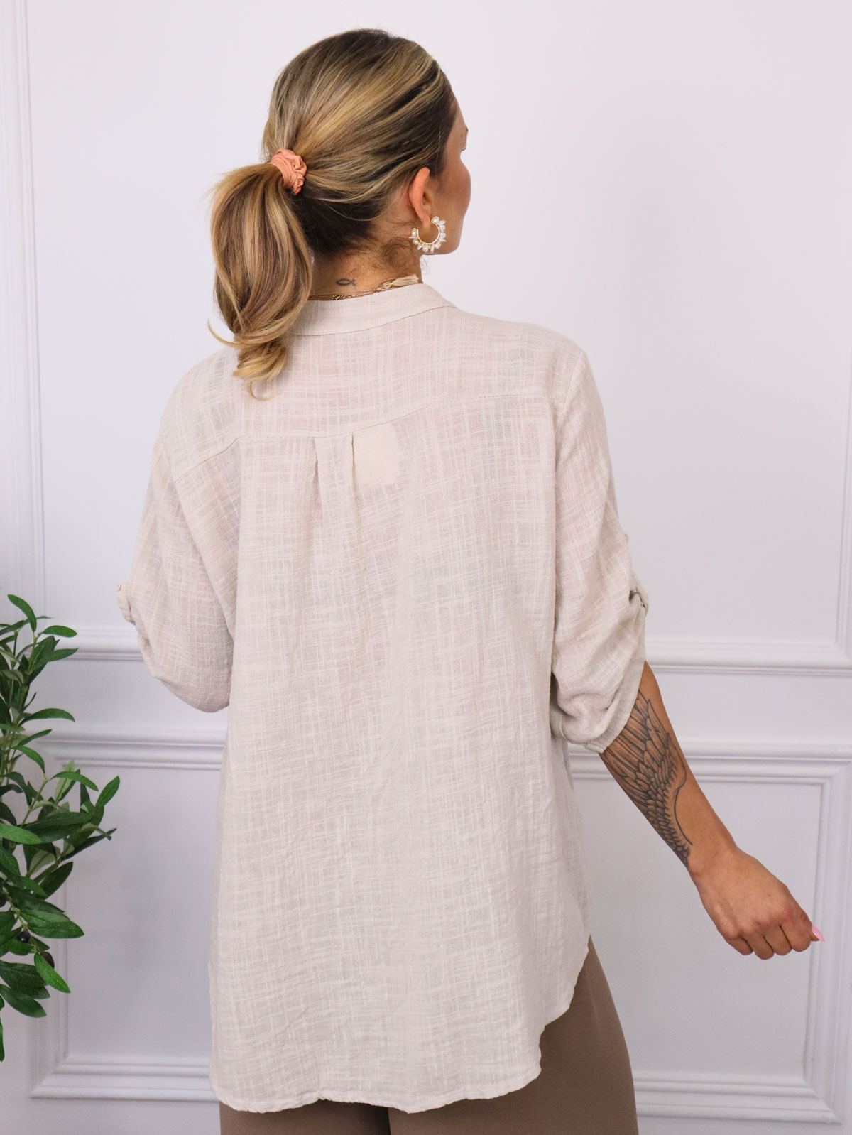 BLUZKA KOSZULOWA ASYMETRYCZNA Z LNEM- BEŻOWA